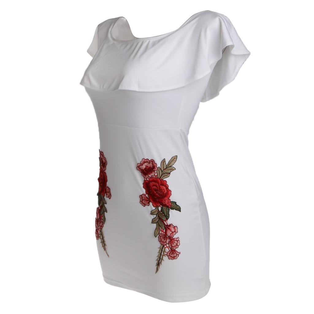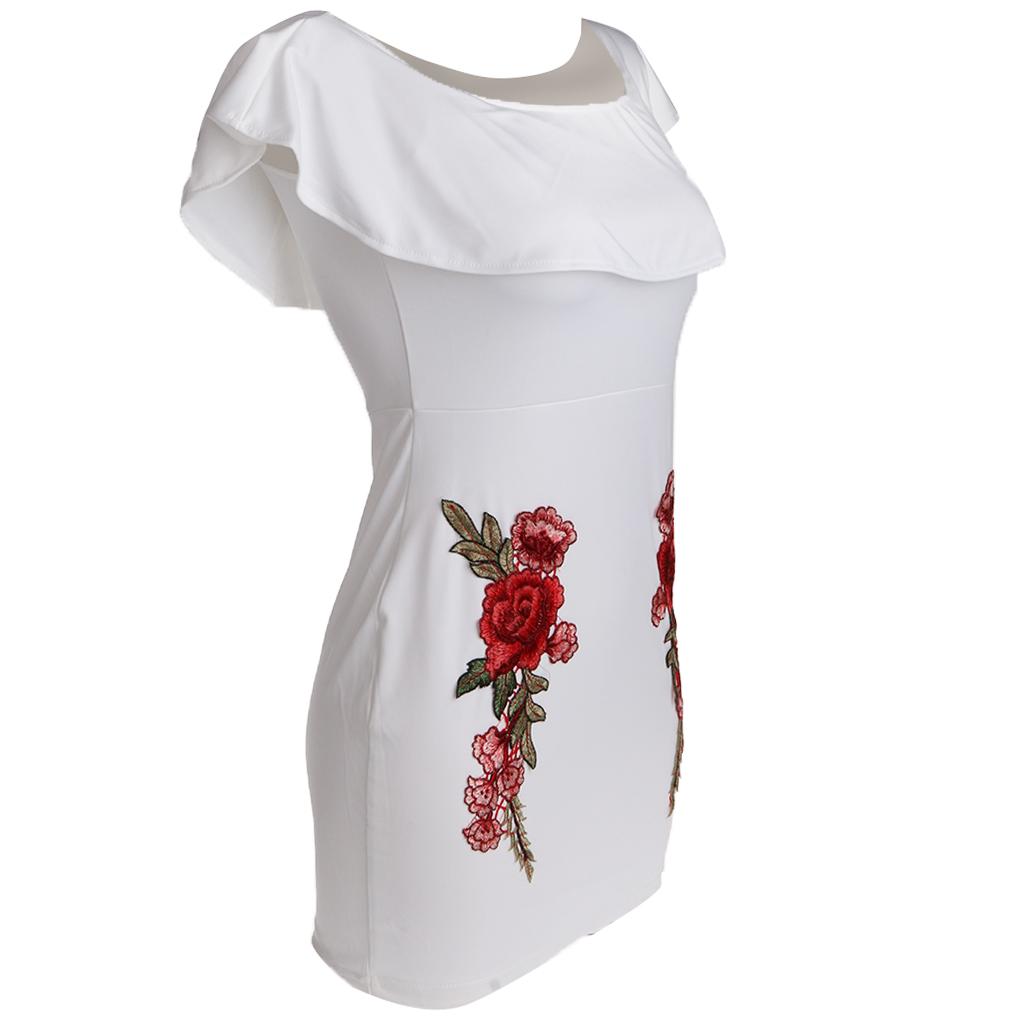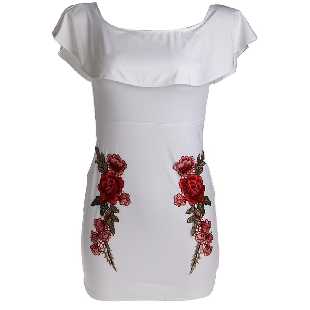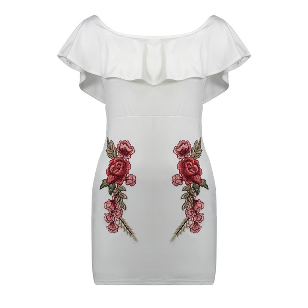 Women Sexy Ruffles Off the Shoulder Embroidered Floral Bodycon Party Dress.
