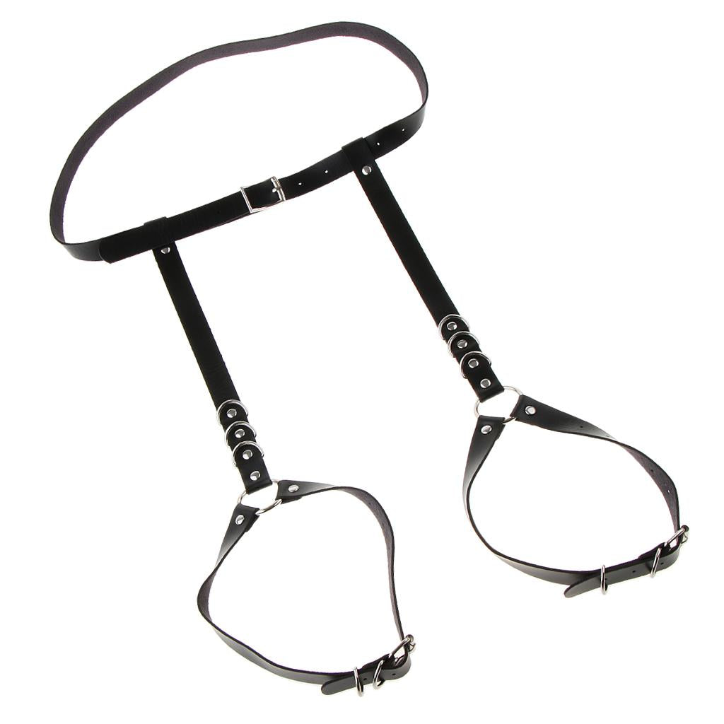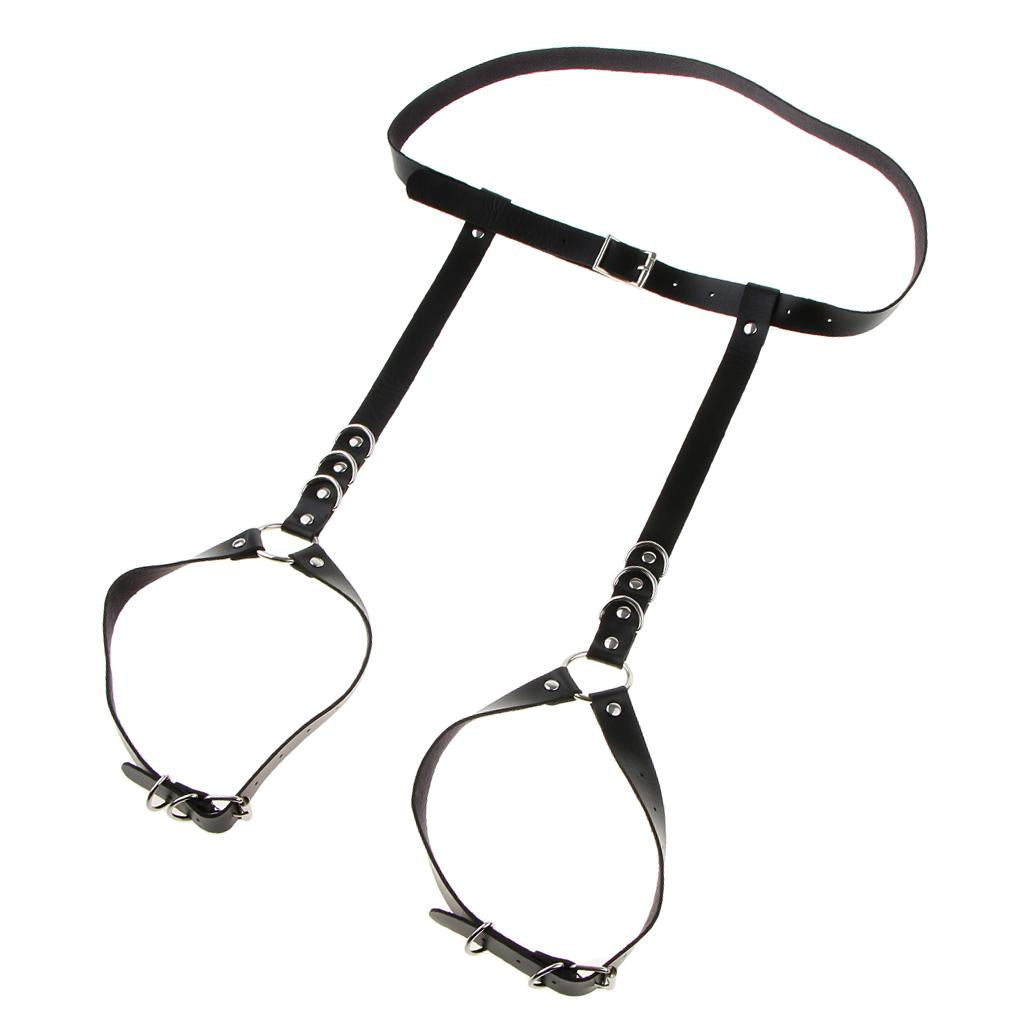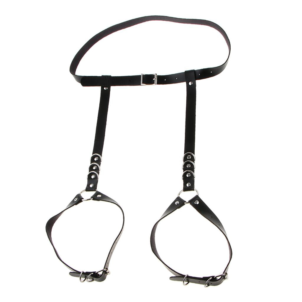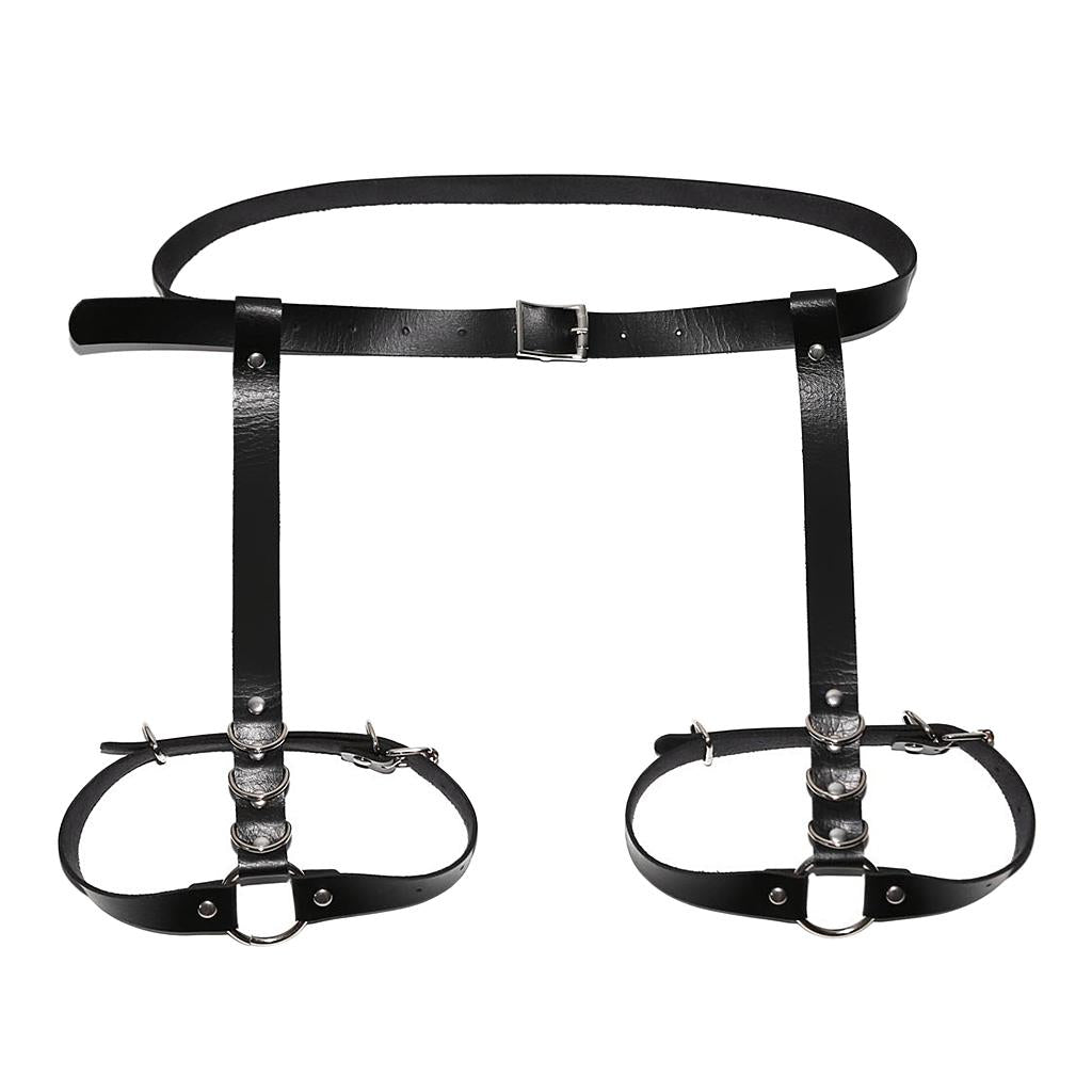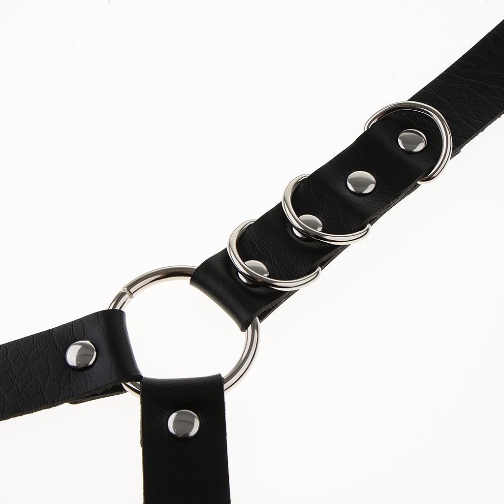 PU leather body harness belt, punk style, adjustable waist, leg rings with O-rings and studs.