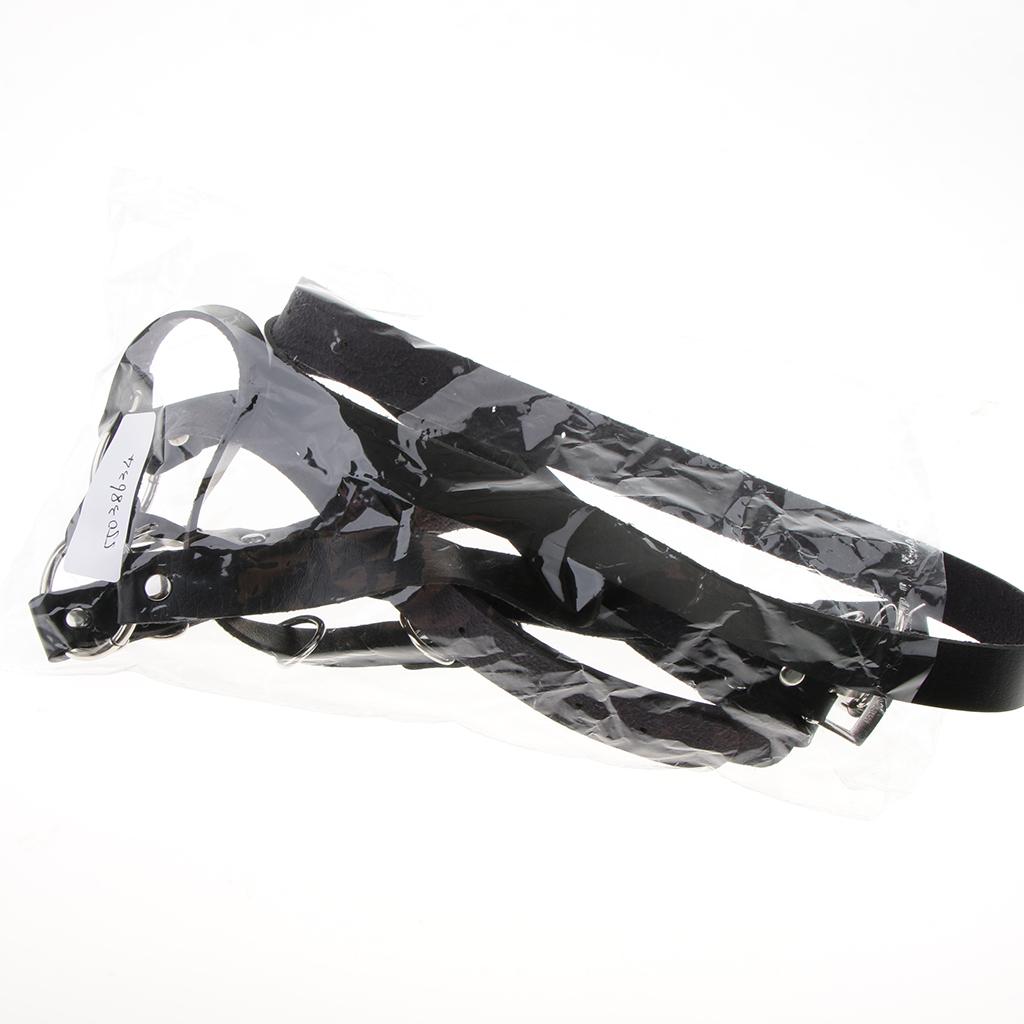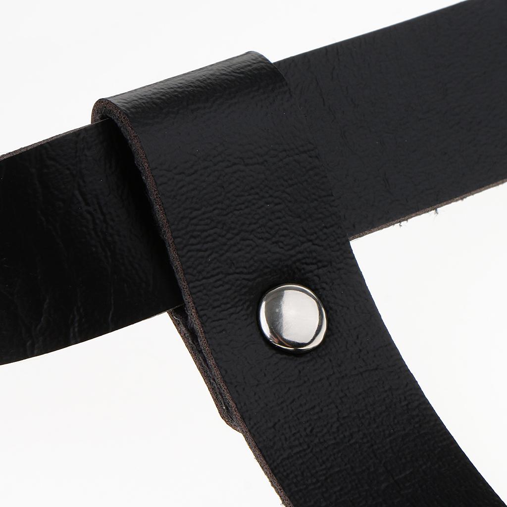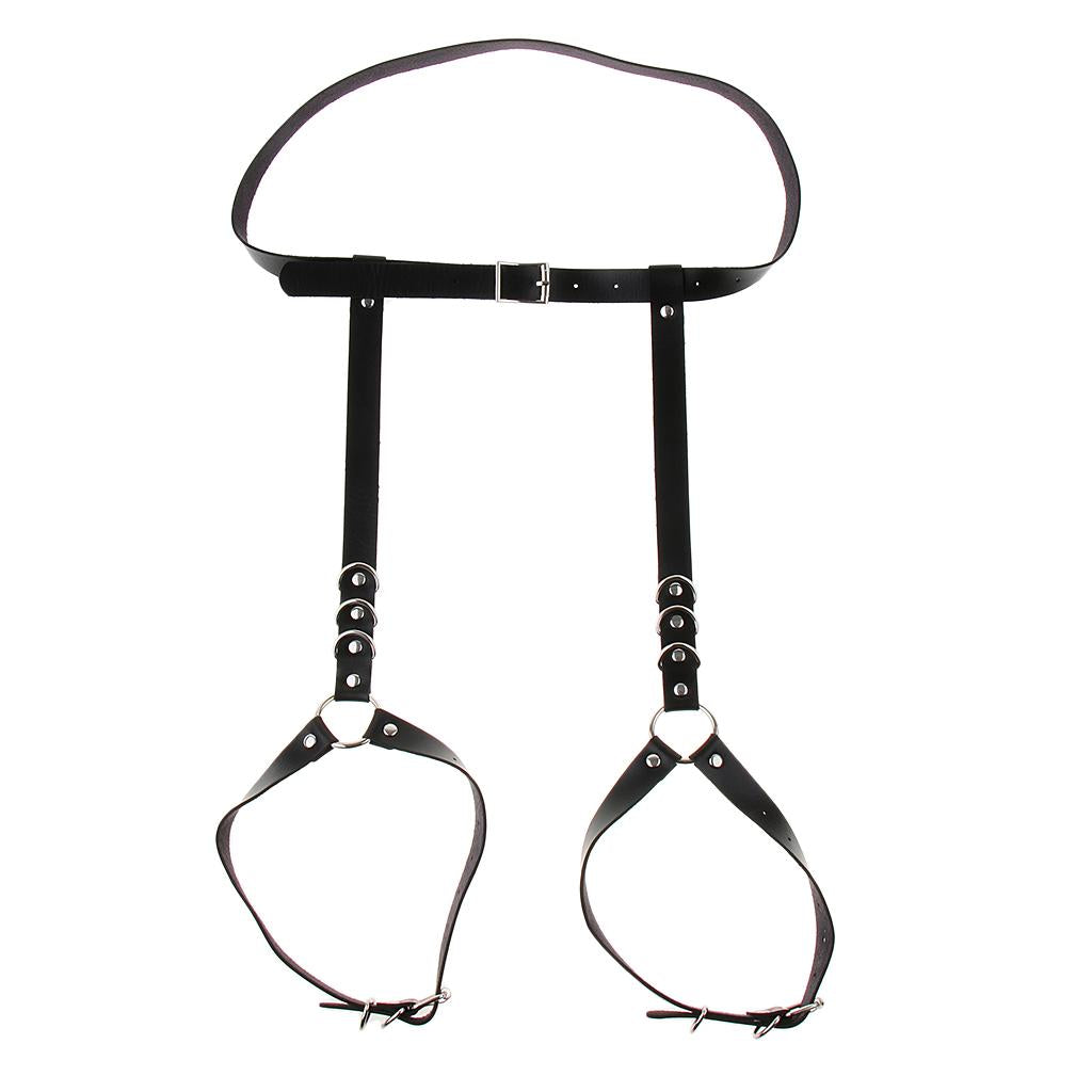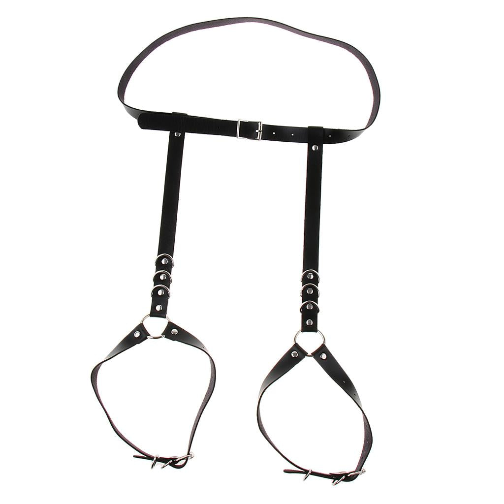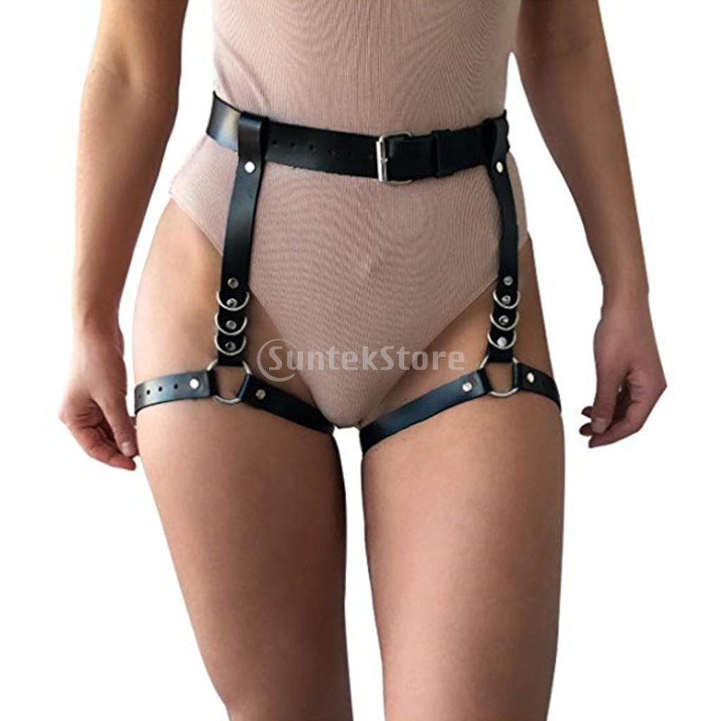 PU leather body harness belt, punk style, adjustable waist, leg rings with O-rings and studs.