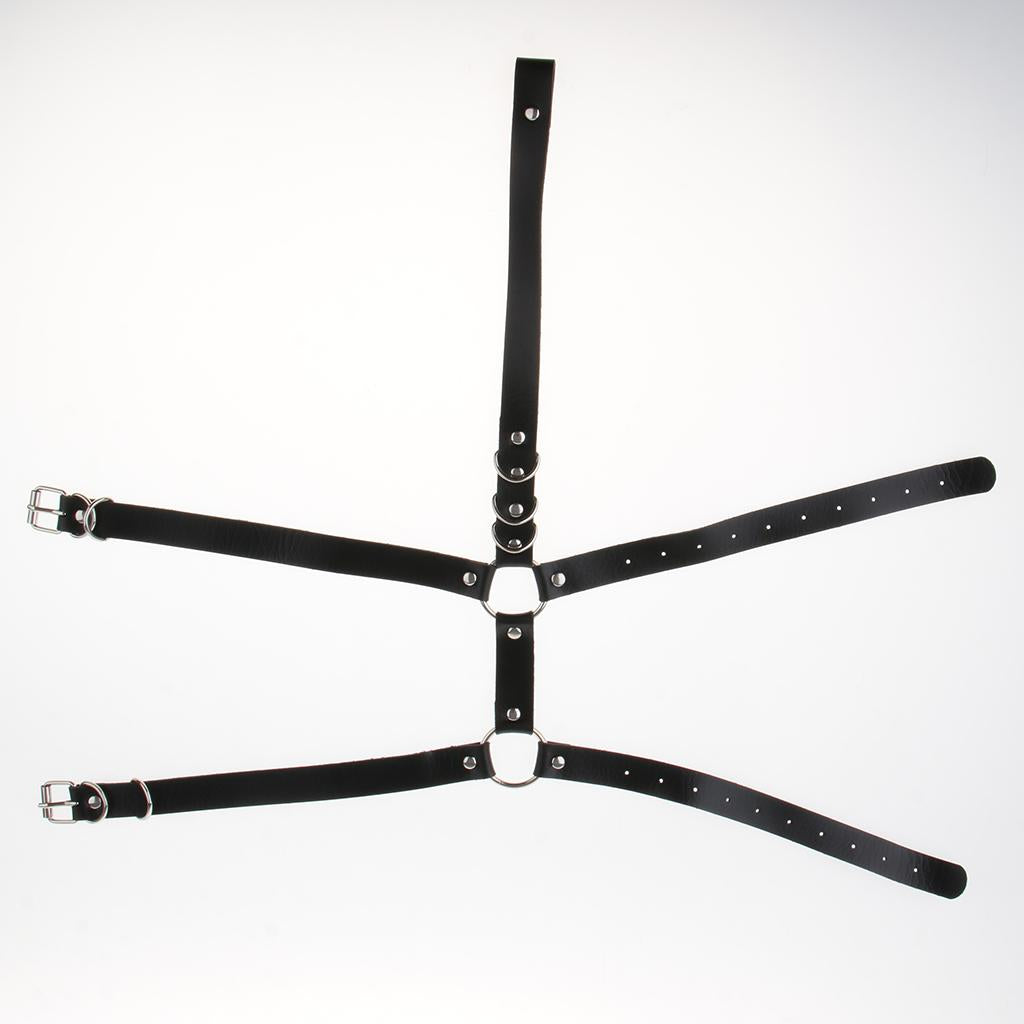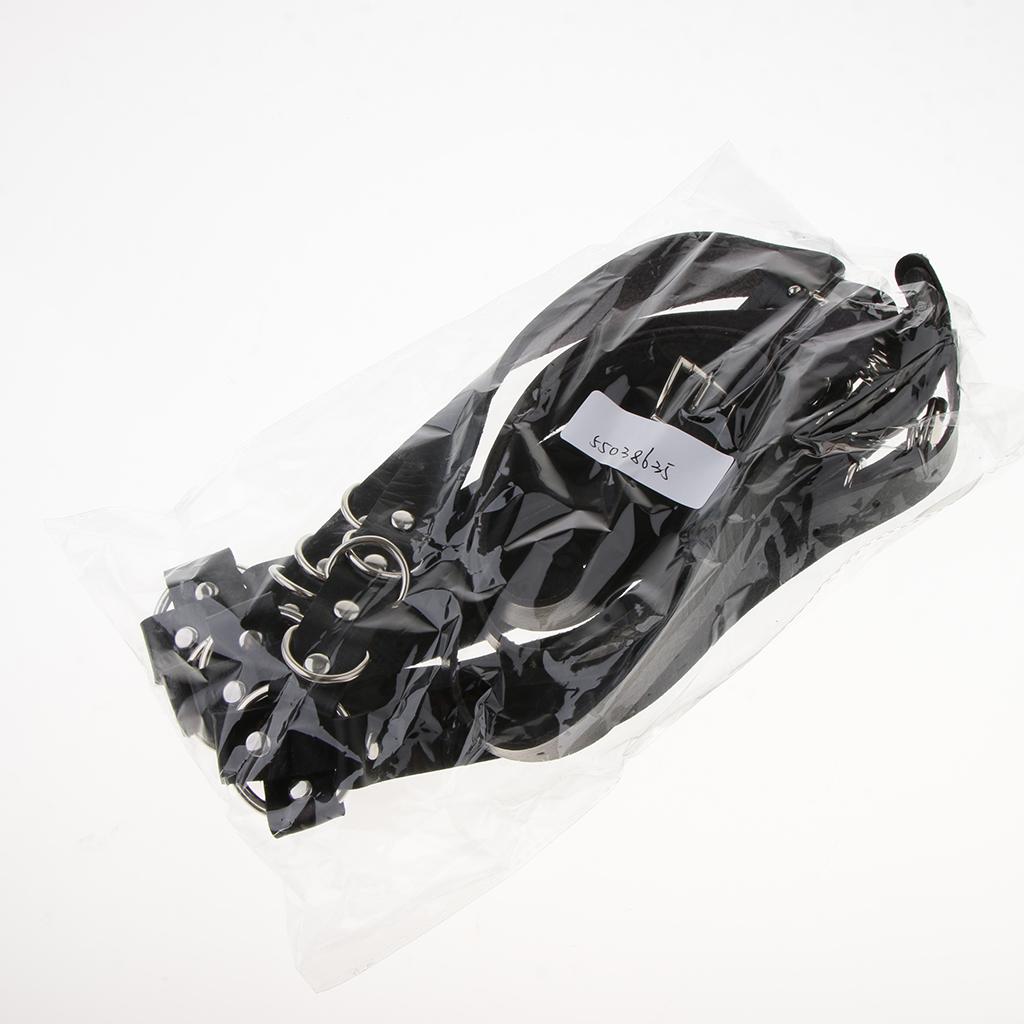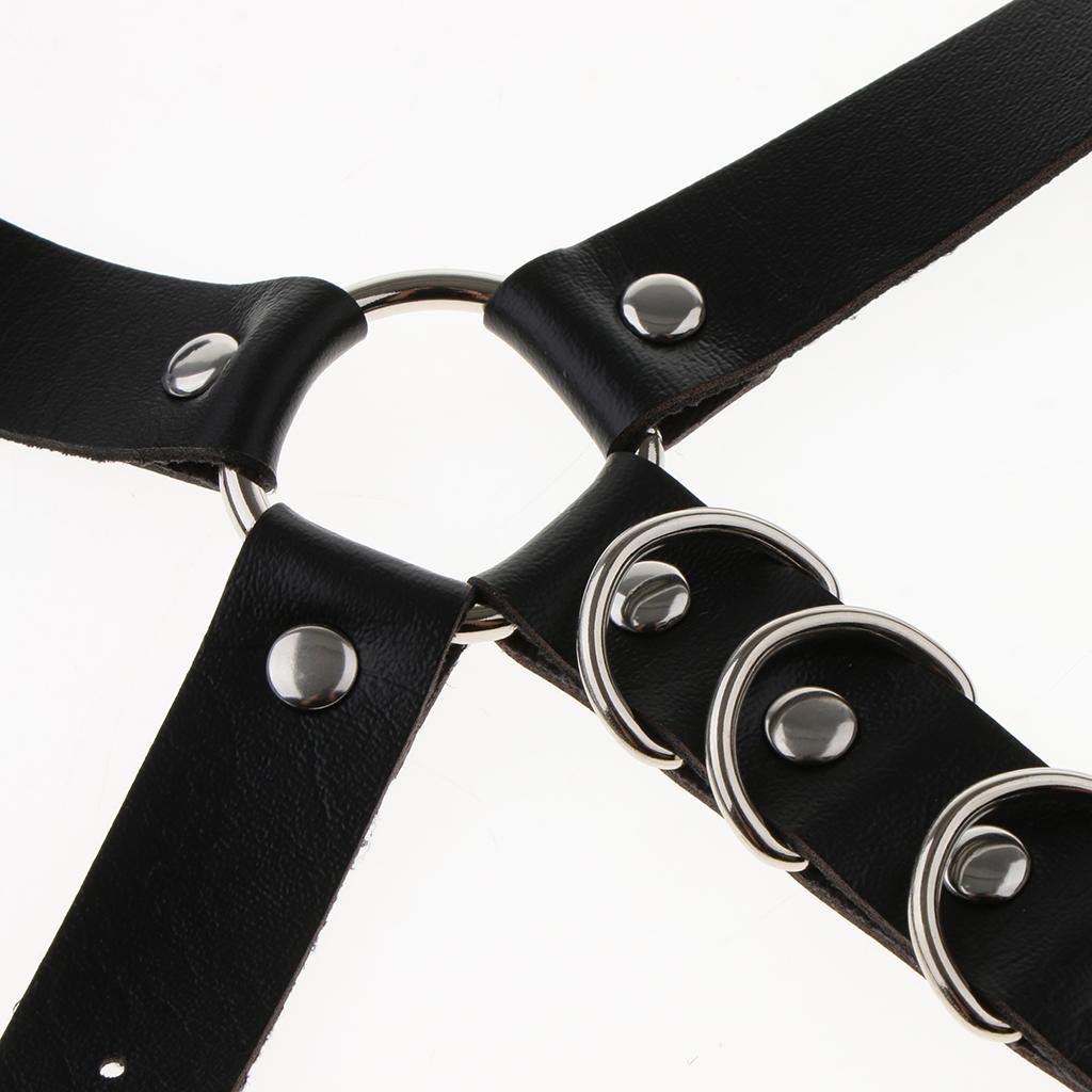 PU leather body harness belt, punk style, adjustable waist, leg rings with O-rings and studs.