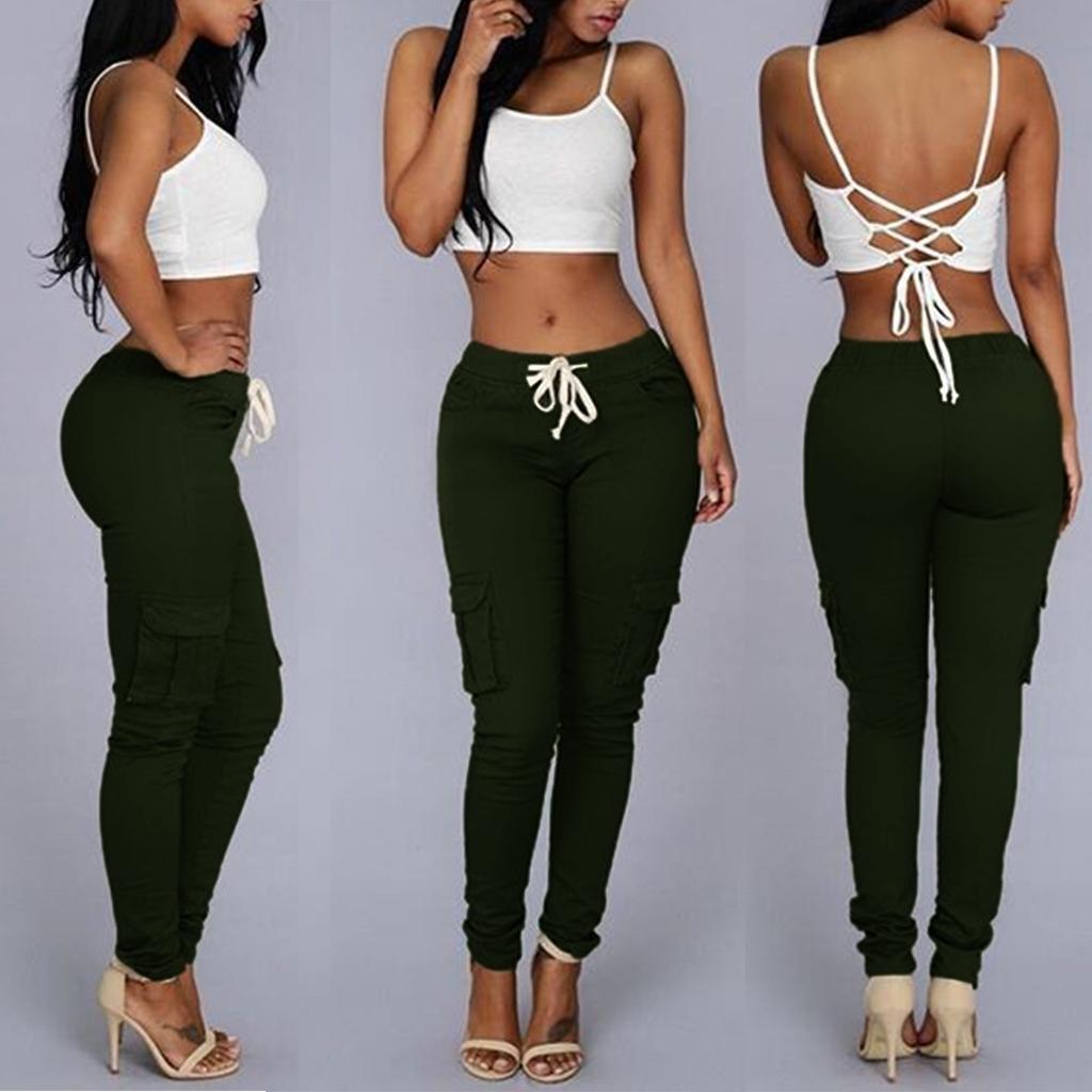 Womens Stretch Pencil Pants Casual Multi Pockets Trousers S Army Green
