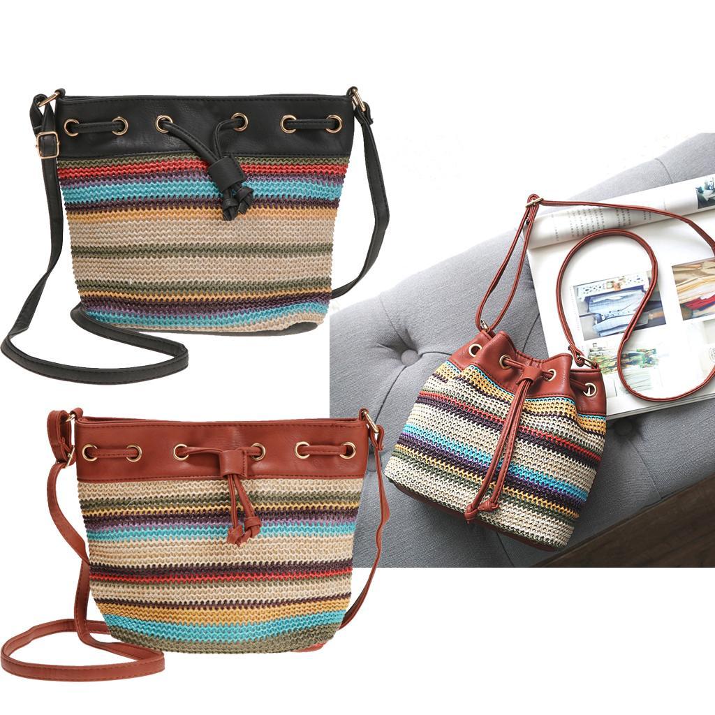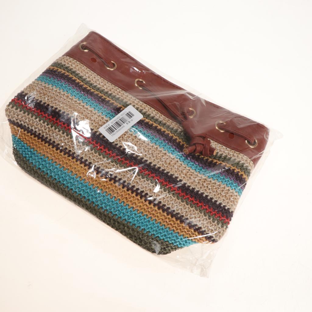 1 Piece Lady Bohemian Wave Stripe Bucket Bag with Slanted Shoulder Bag Brown