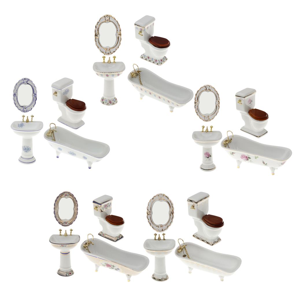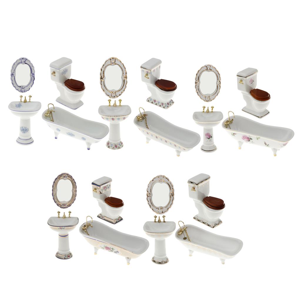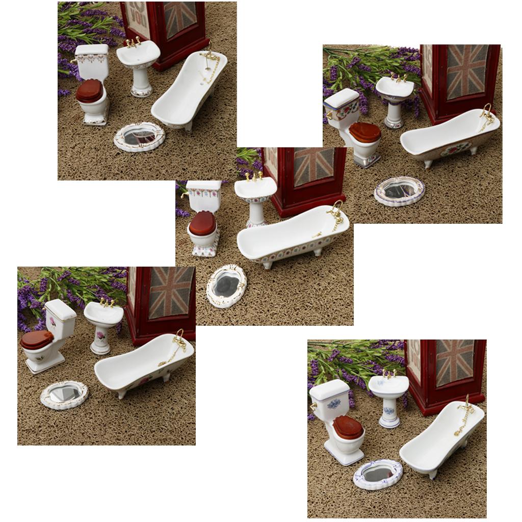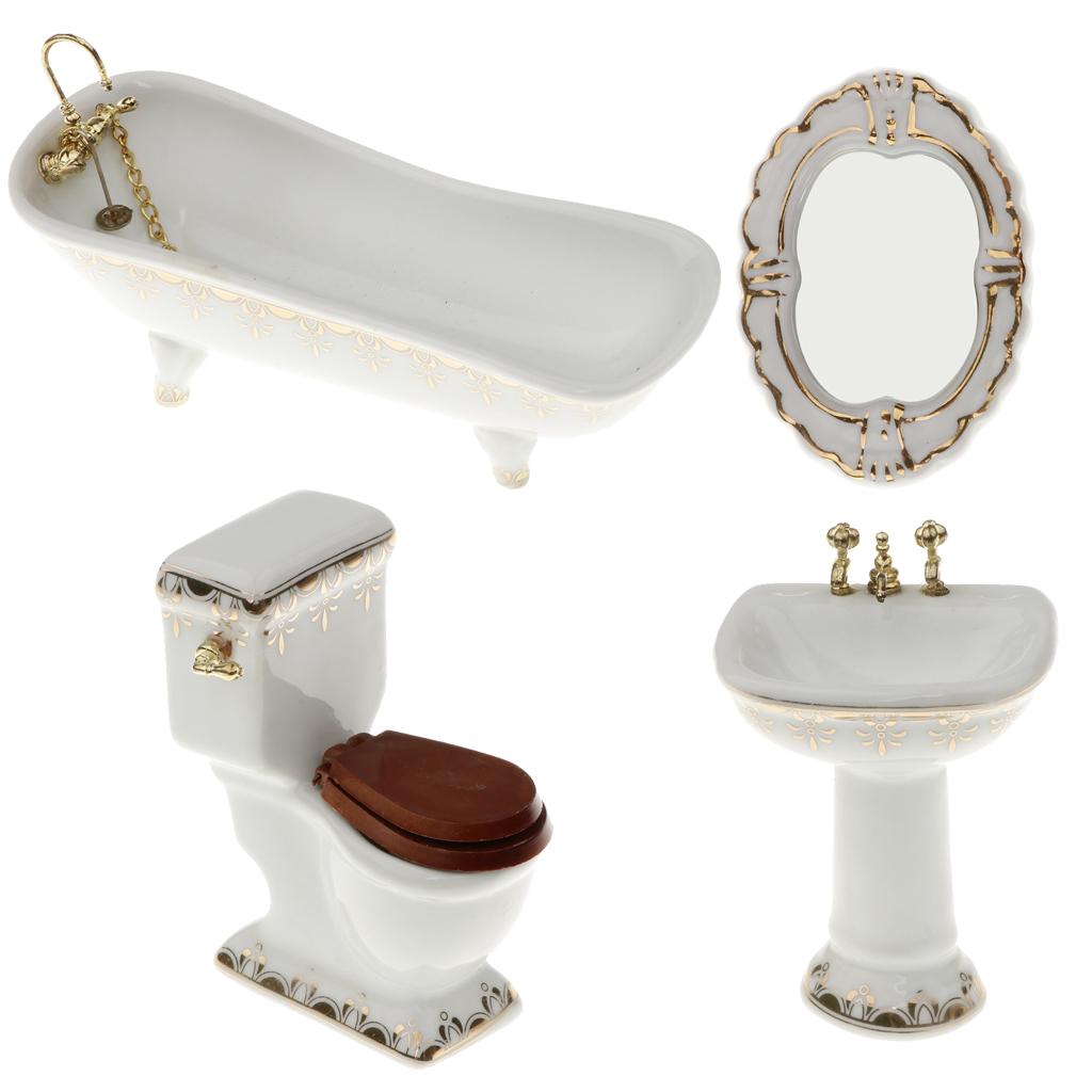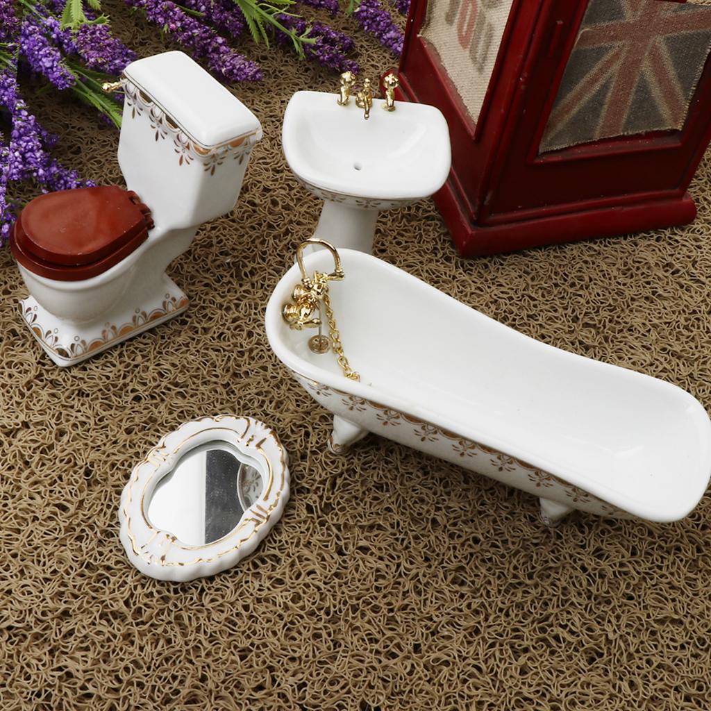 Include toliet, bathtub, hand sink and mirror for dollhouse furniture decoration