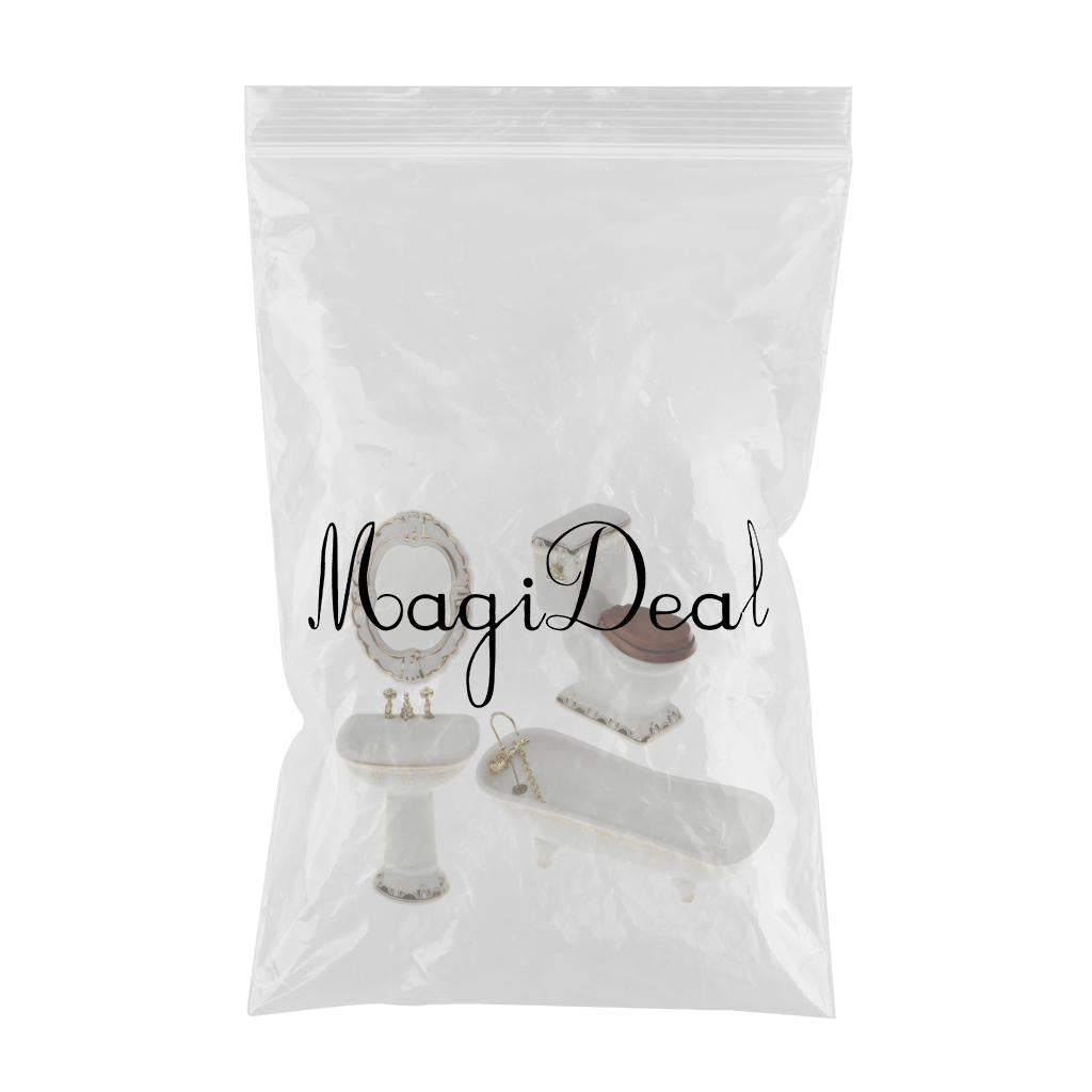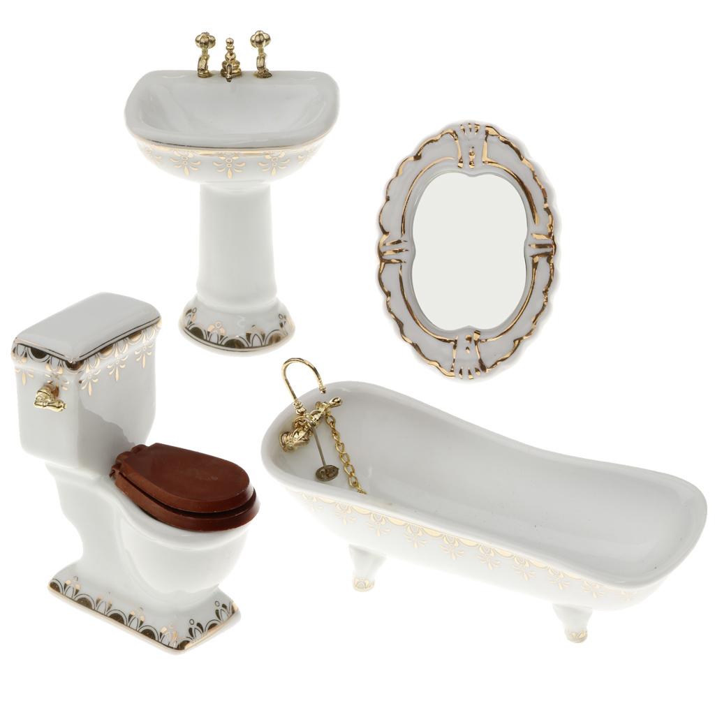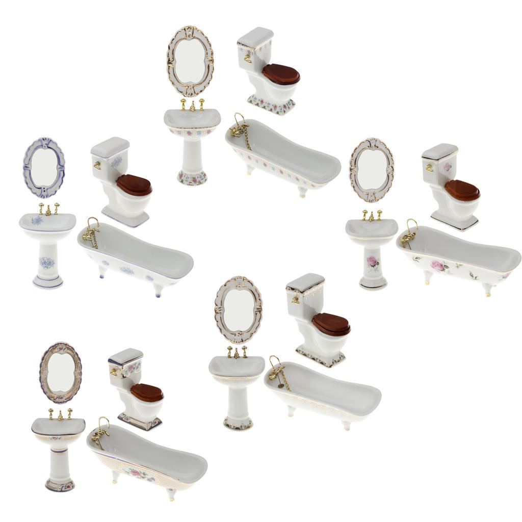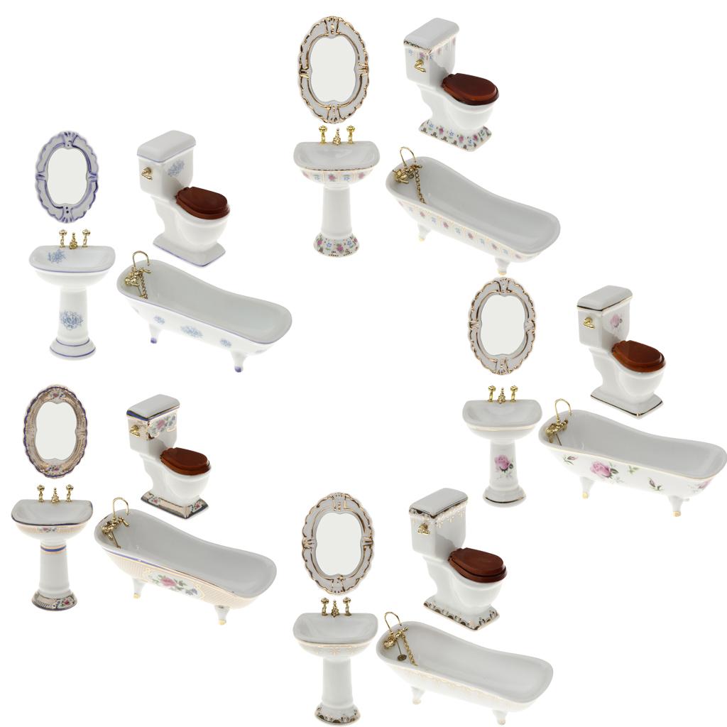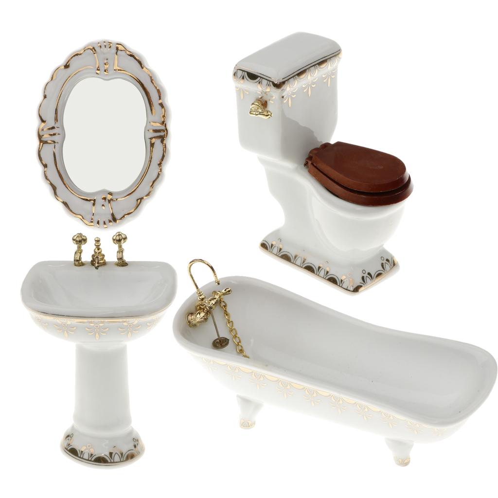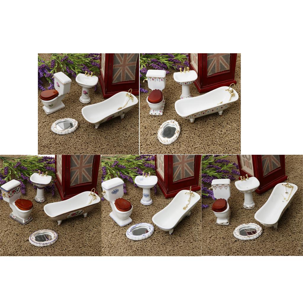 Include toliet, bathtub, hand sink and mirror for dollhouse furniture decoration