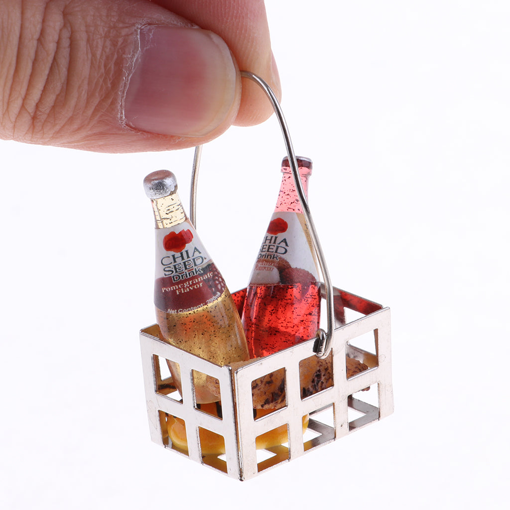 1/12 Dollhouse furniture mini metal bread basket with 2 pieces beverages bottles set, bottles and bread are removable