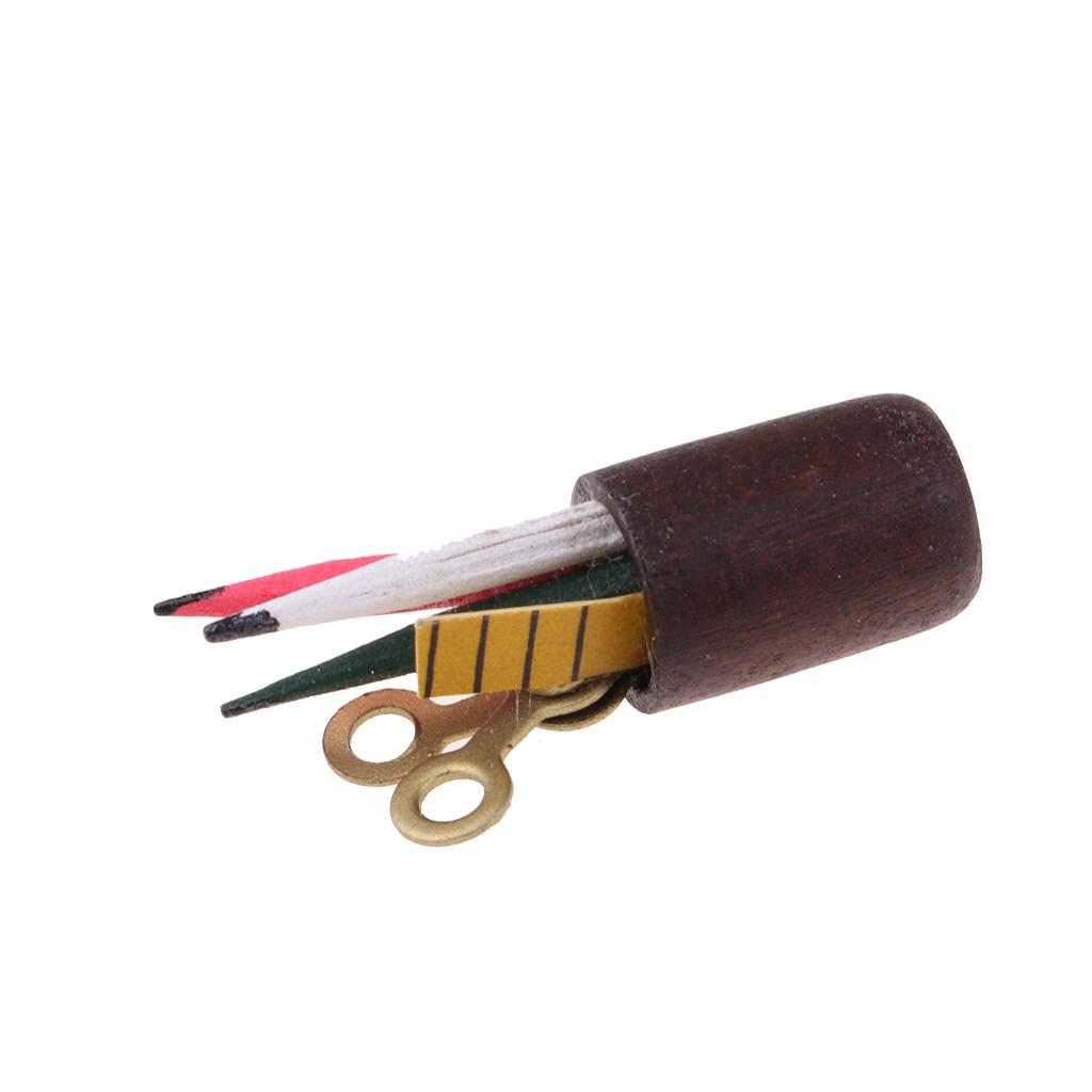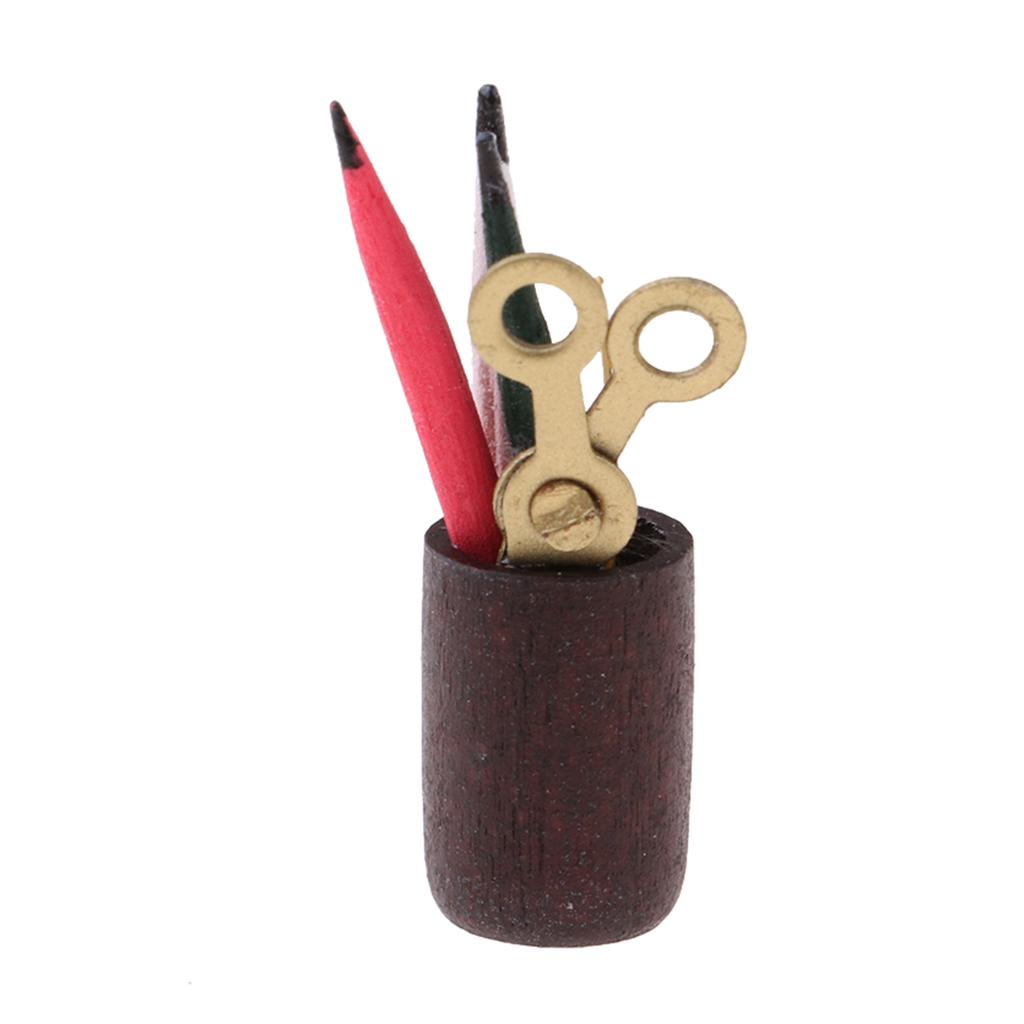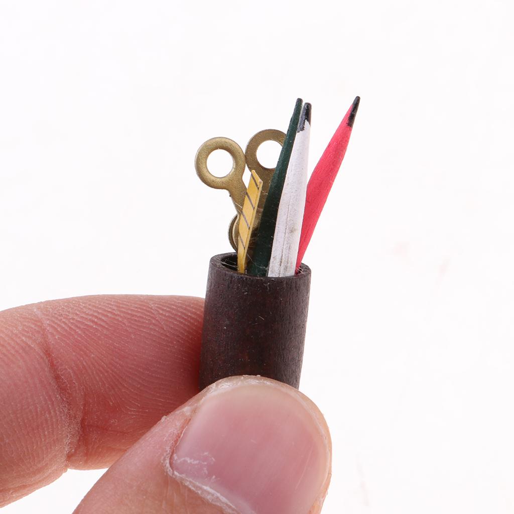 Handmade miniature wooden pen cup pen holder, including 3 pieces pencils, 1 piece ruler and 1 pair of scissor model for dollhouse kids DIY projects