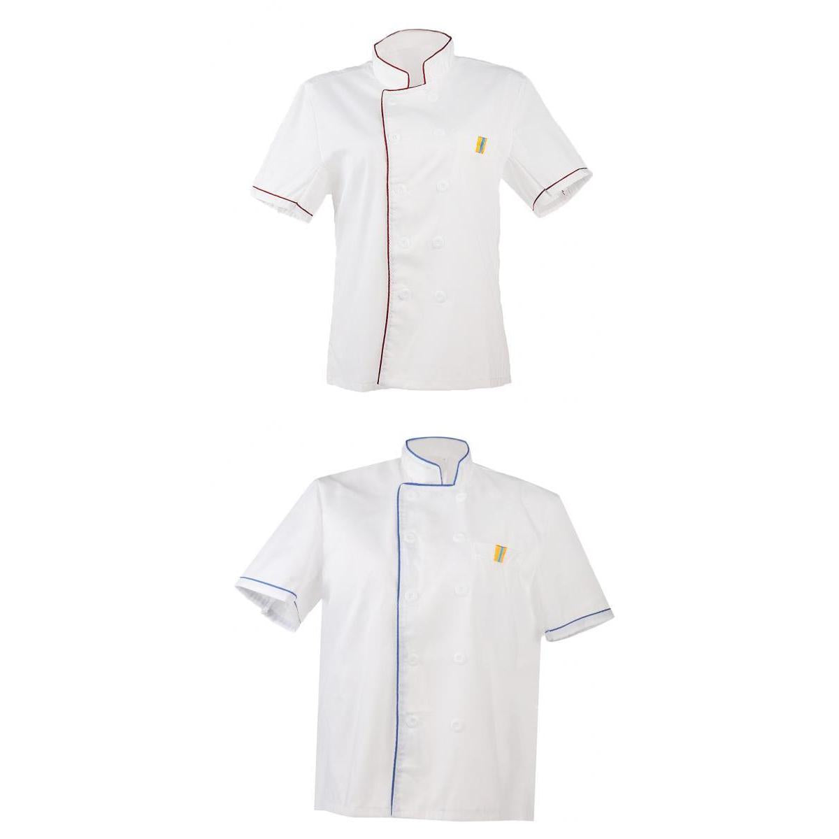 Features: short sleeves, single-breasted, patch pocket on left chest, blue and red trim