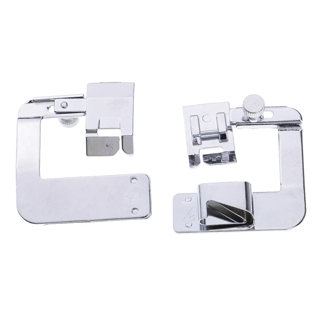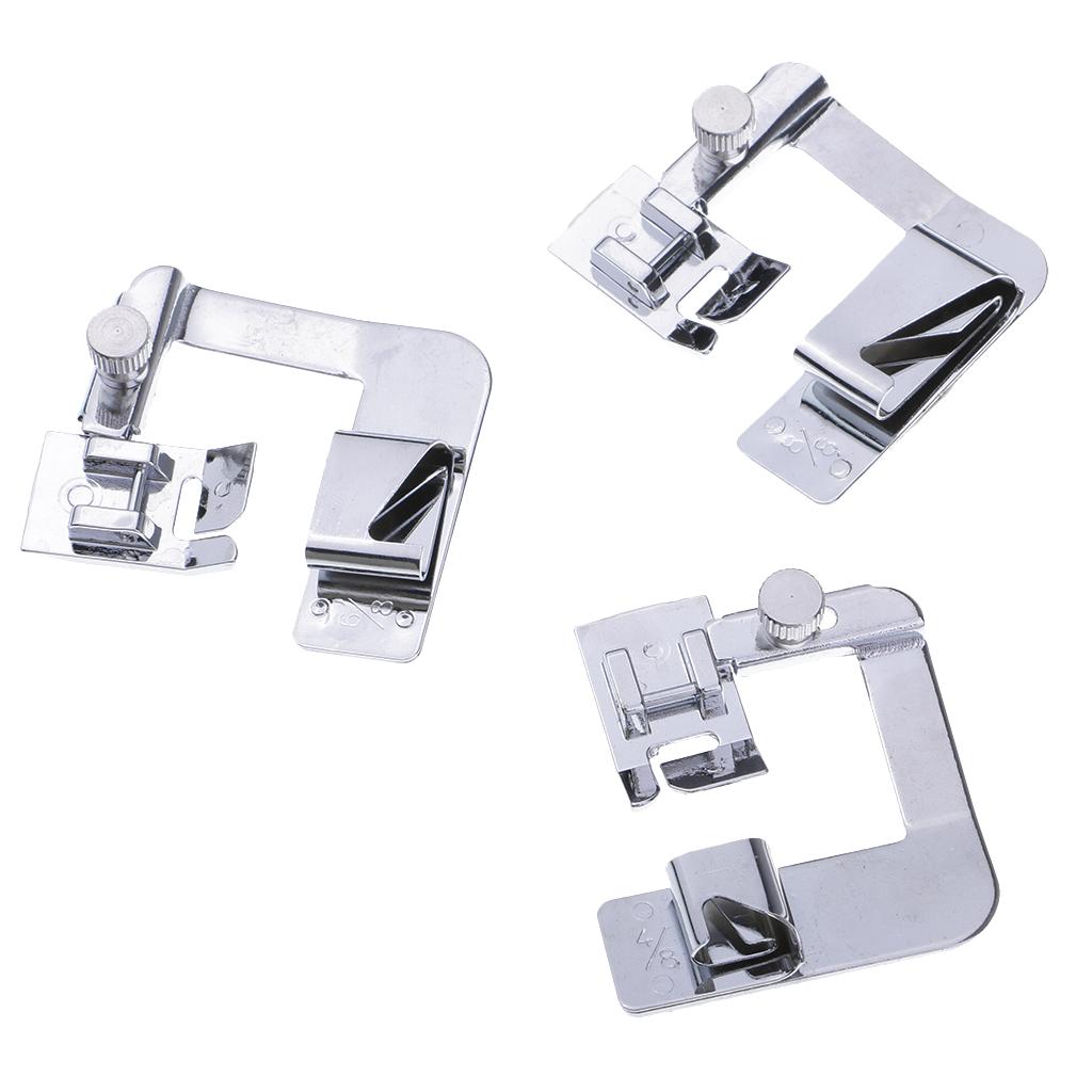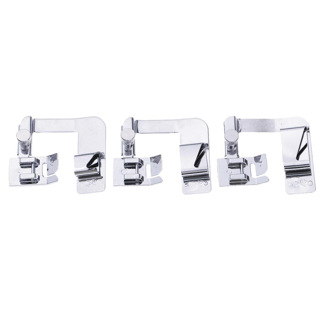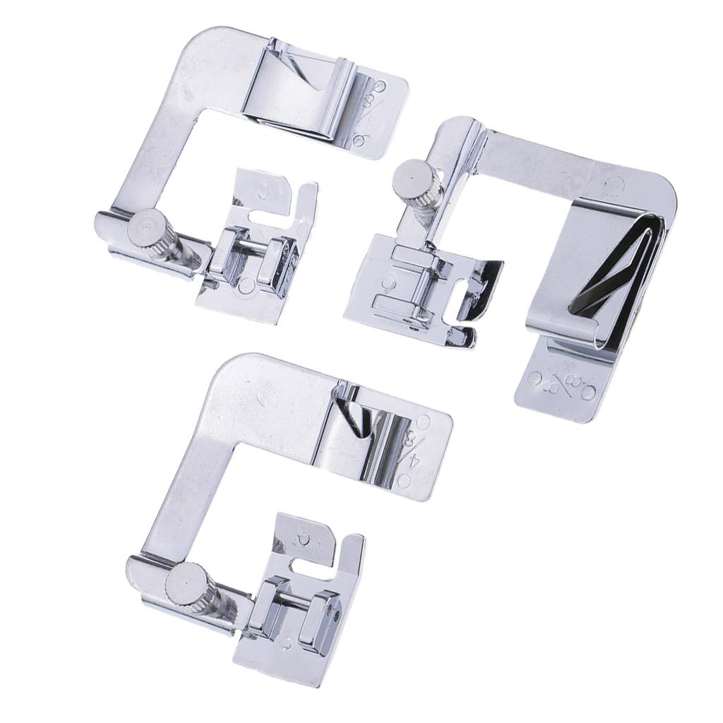 4/8" hemmer foot (13mm wide rolled hems), 6/8" hemmer foot (19mm wide rolled hems), 8/8" hemmer foot (25mm wide rolled hems)