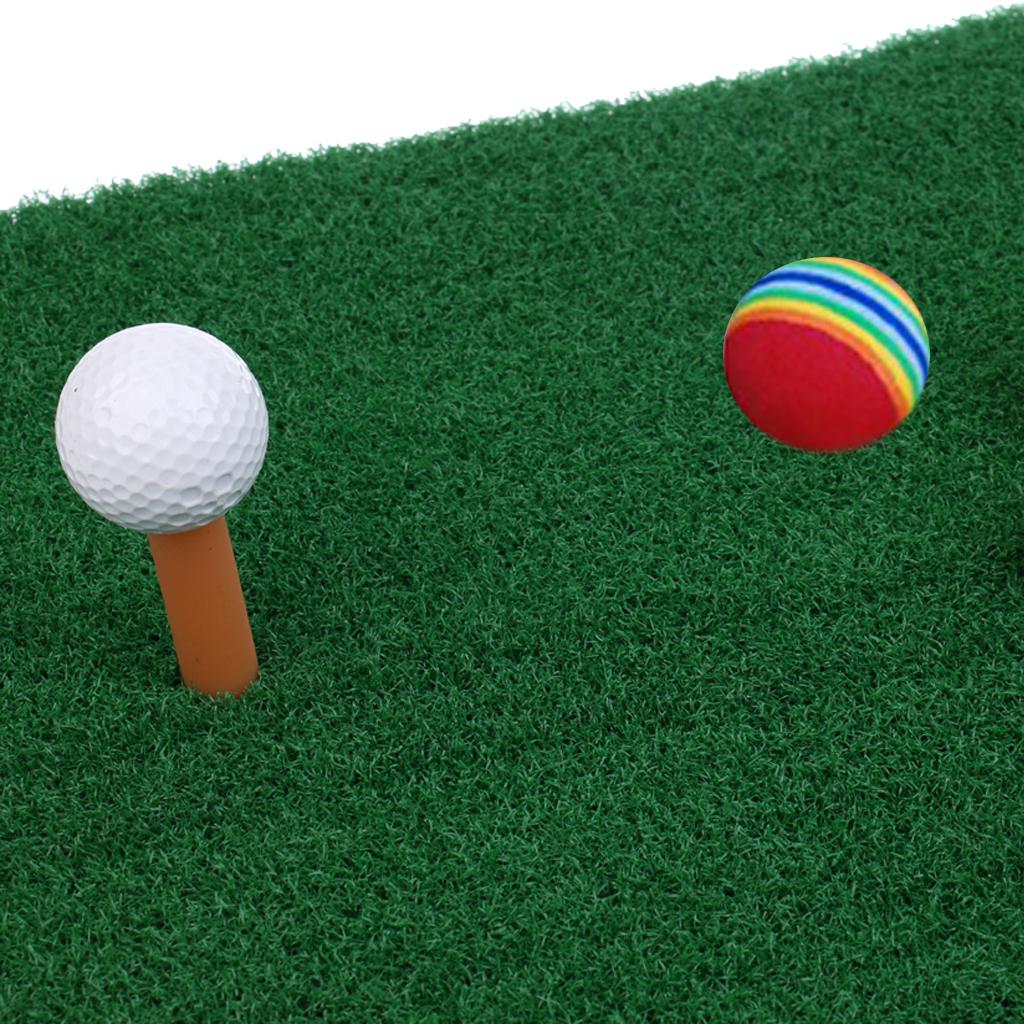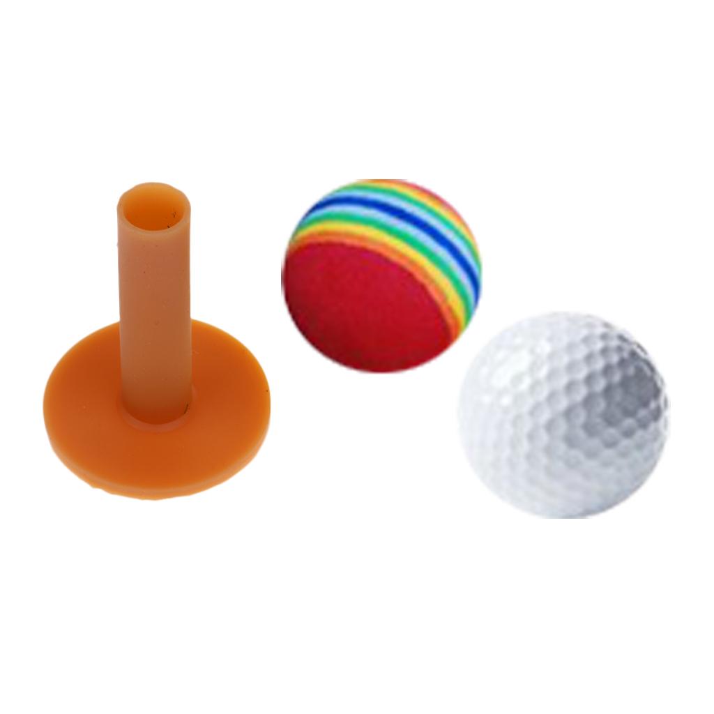 Comes with 1 piece mat, 1 piece tee, 2 pieces hard golf balls, 1 piece soft golf ball