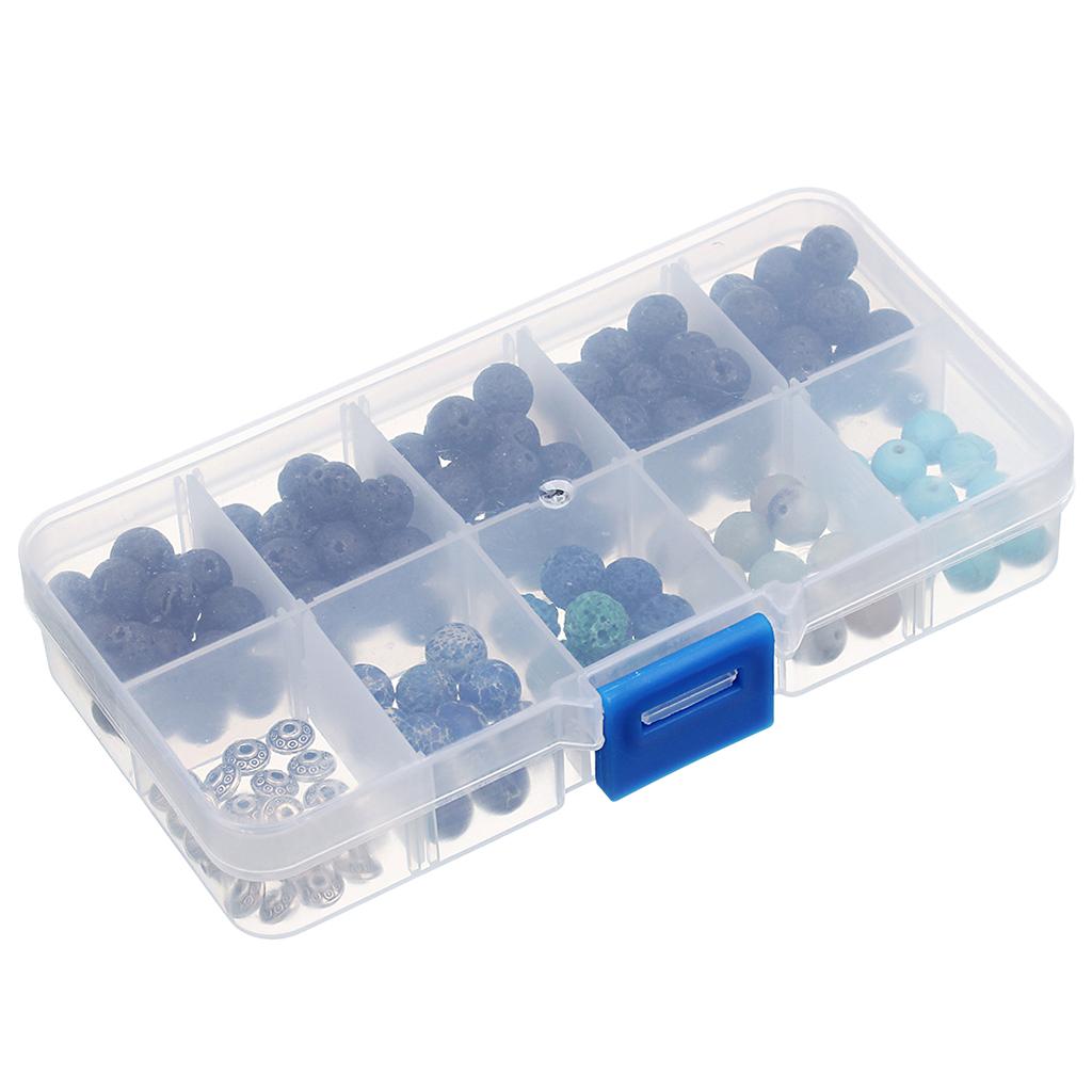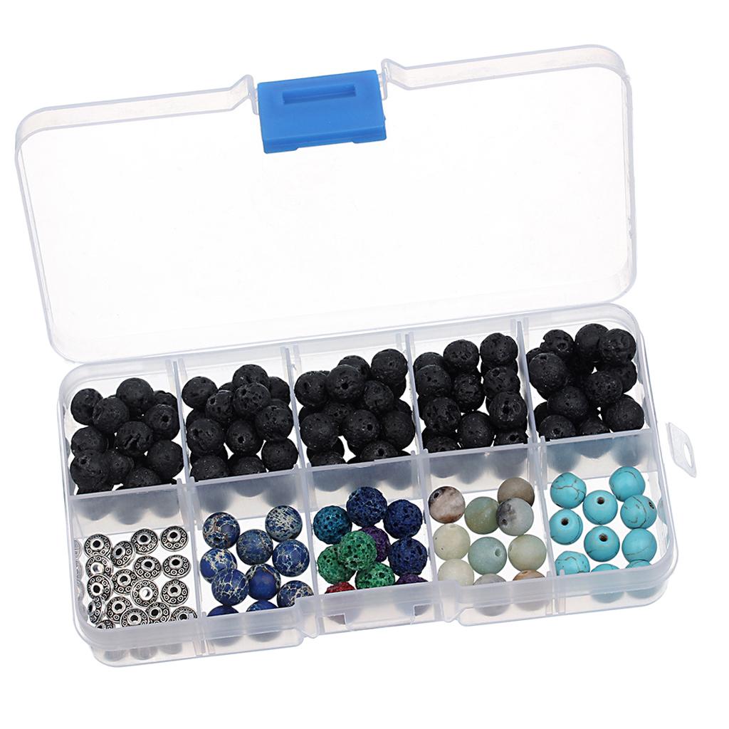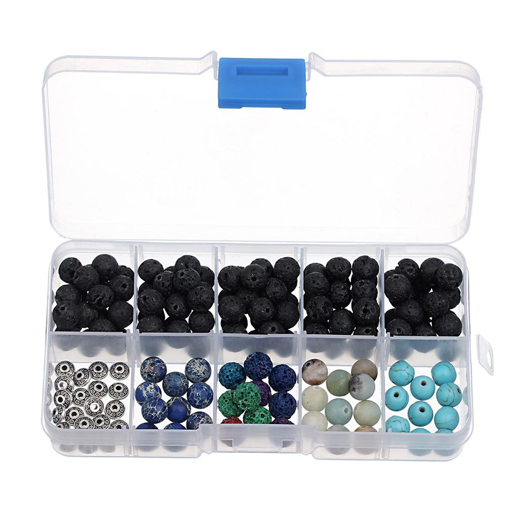 A nice assortment of 110pcs lava beads, 30pcs natural gemstone and 20pcs antique silver spacer beads per box, and they are organized in a plastic box.
