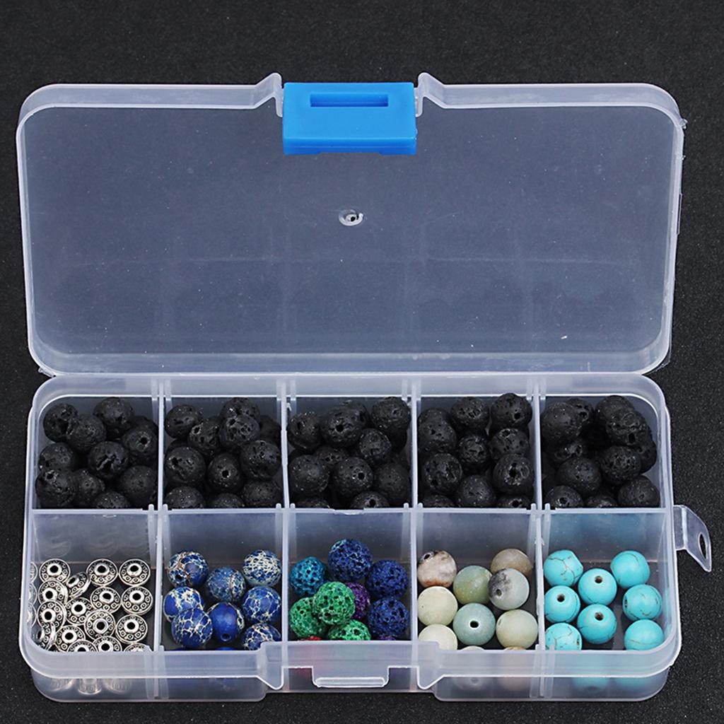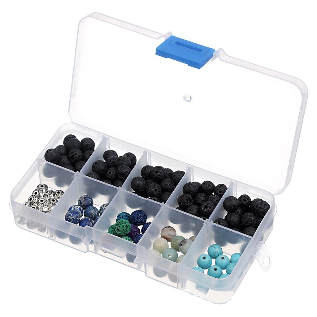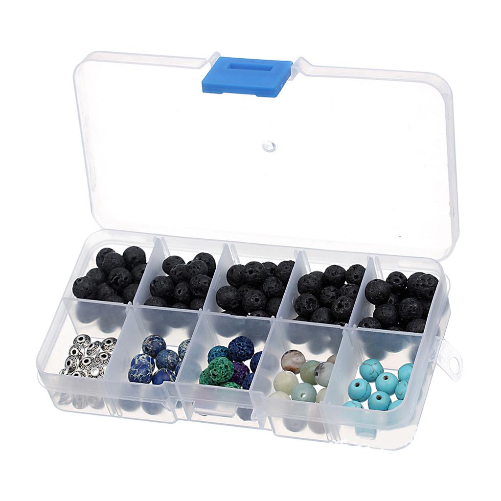 A nice assortment of 110pcs lava beads, 30pcs natural gemstone and 20pcs antique silver spacer beads per box, and they are organized in a plastic box.