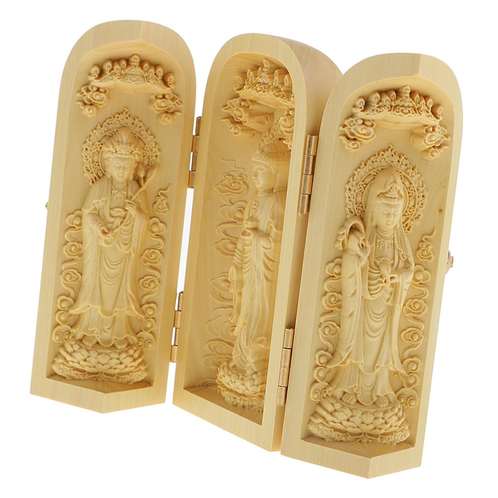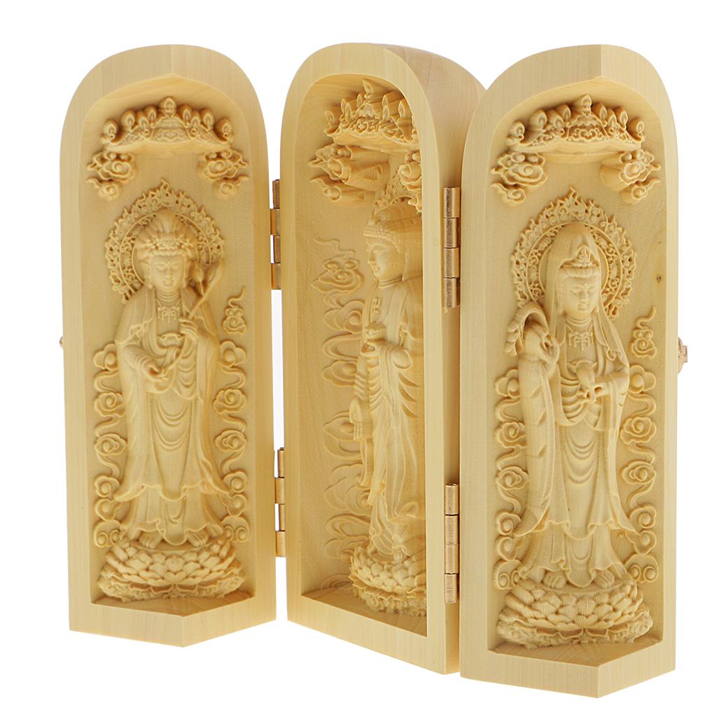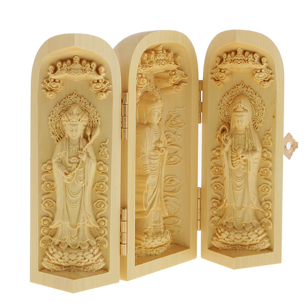 Tibet buddhism Boxwood Carving kwan-yin Avalokitesvara buddha 3 God Statue Box