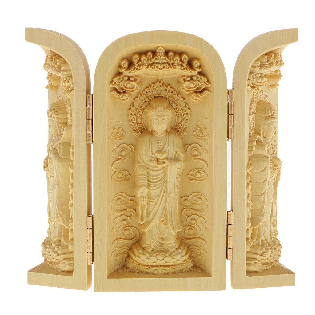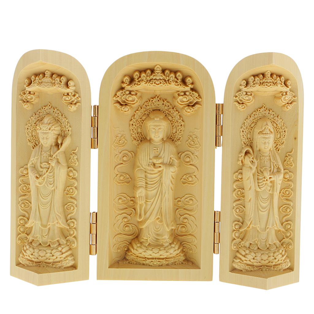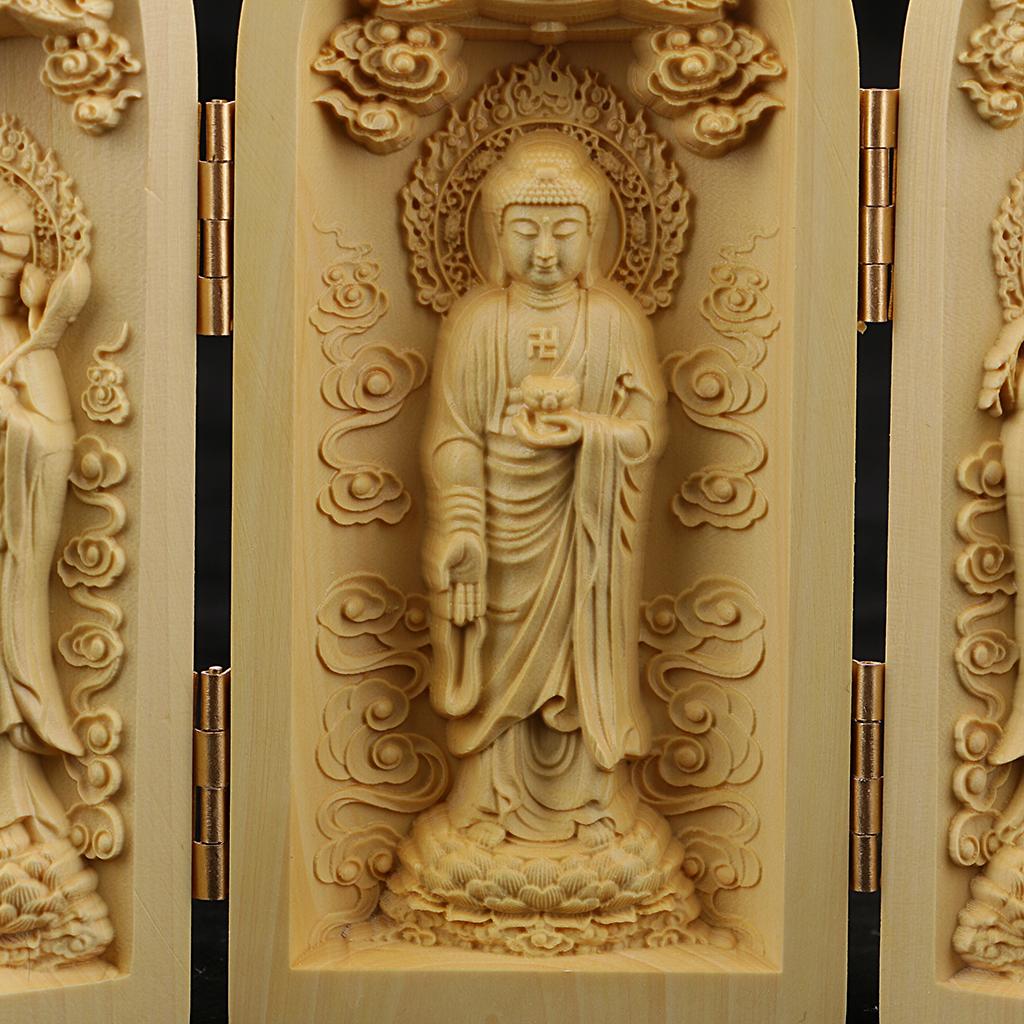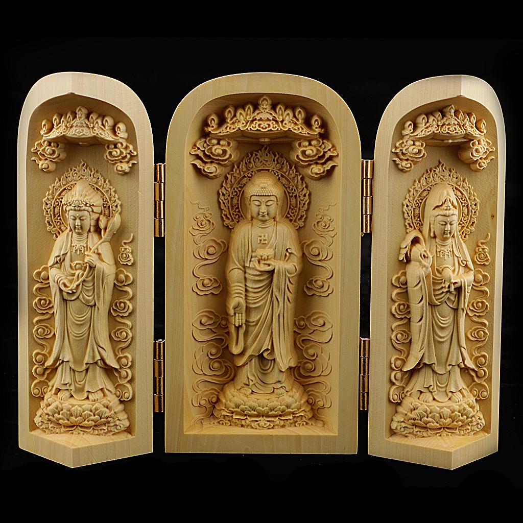 Tibet buddhism Boxwood Carving kwan-yin Avalokitesvara buddha 3 God Statue Box