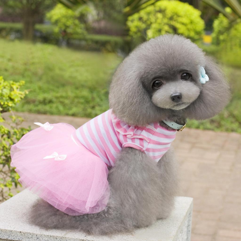 Cute Small Puppy Pet Dog Stripe Bow Lace Skirt Princess Dress Pink--XS
