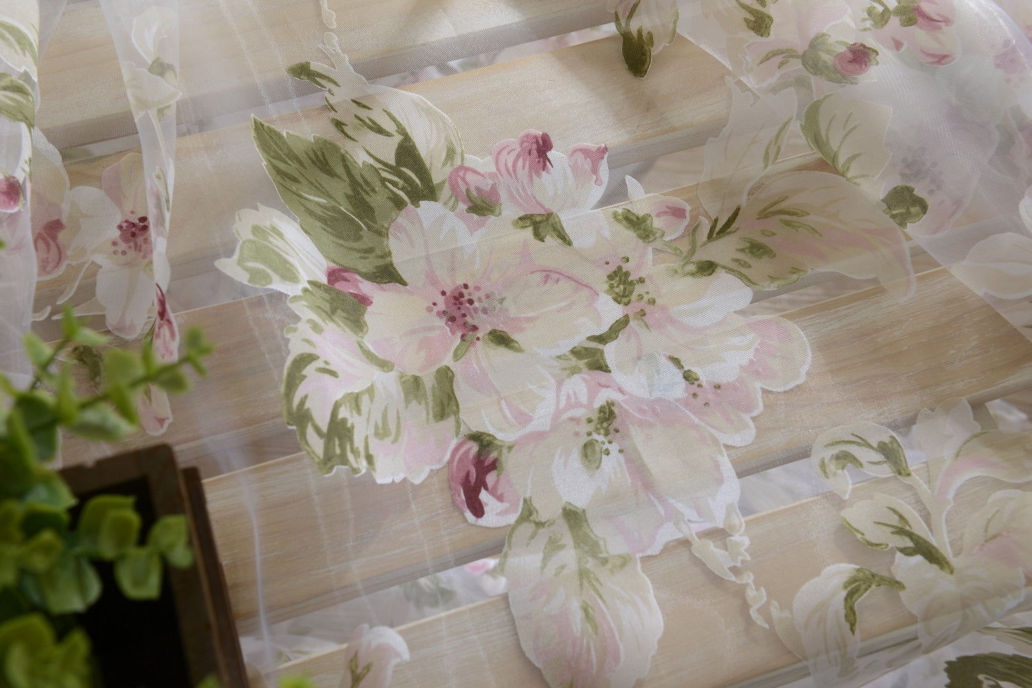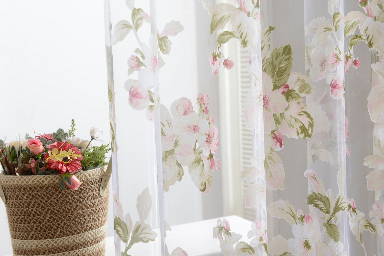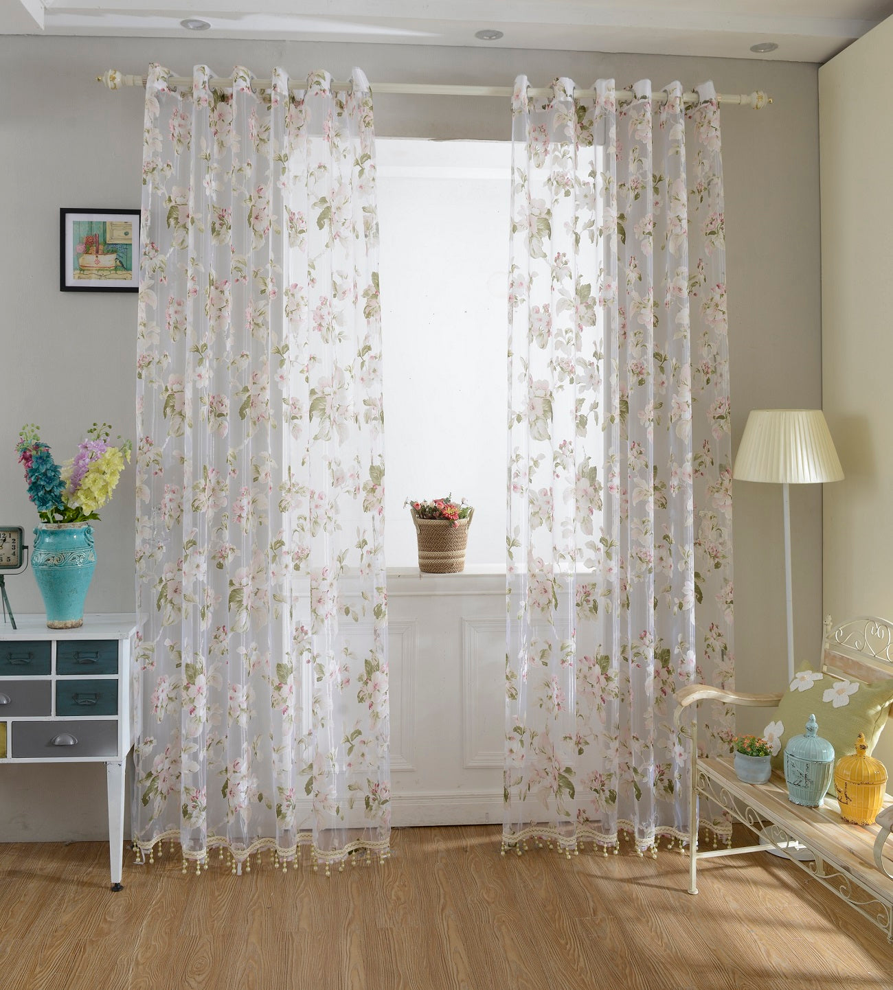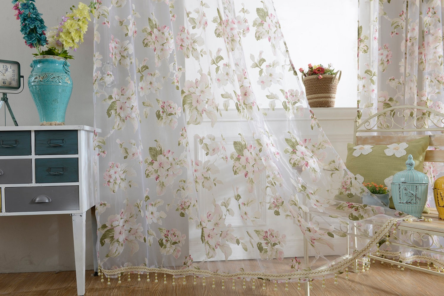 Floral Tulle Sheer Curtains Window Blinds Panel Bead Trims Pink 100x200cm