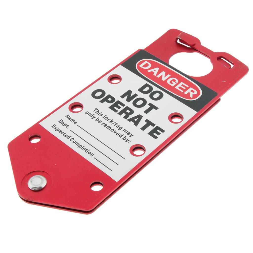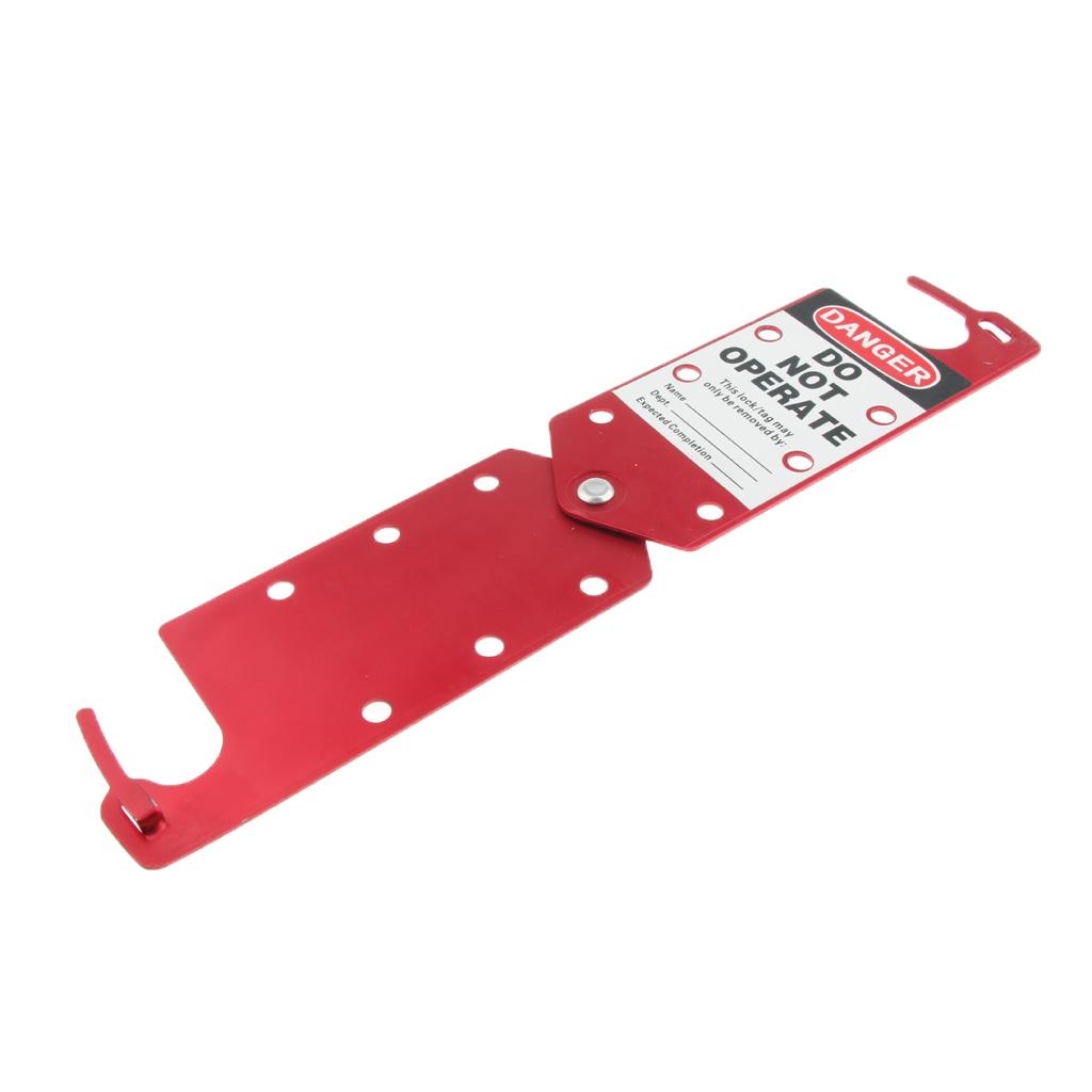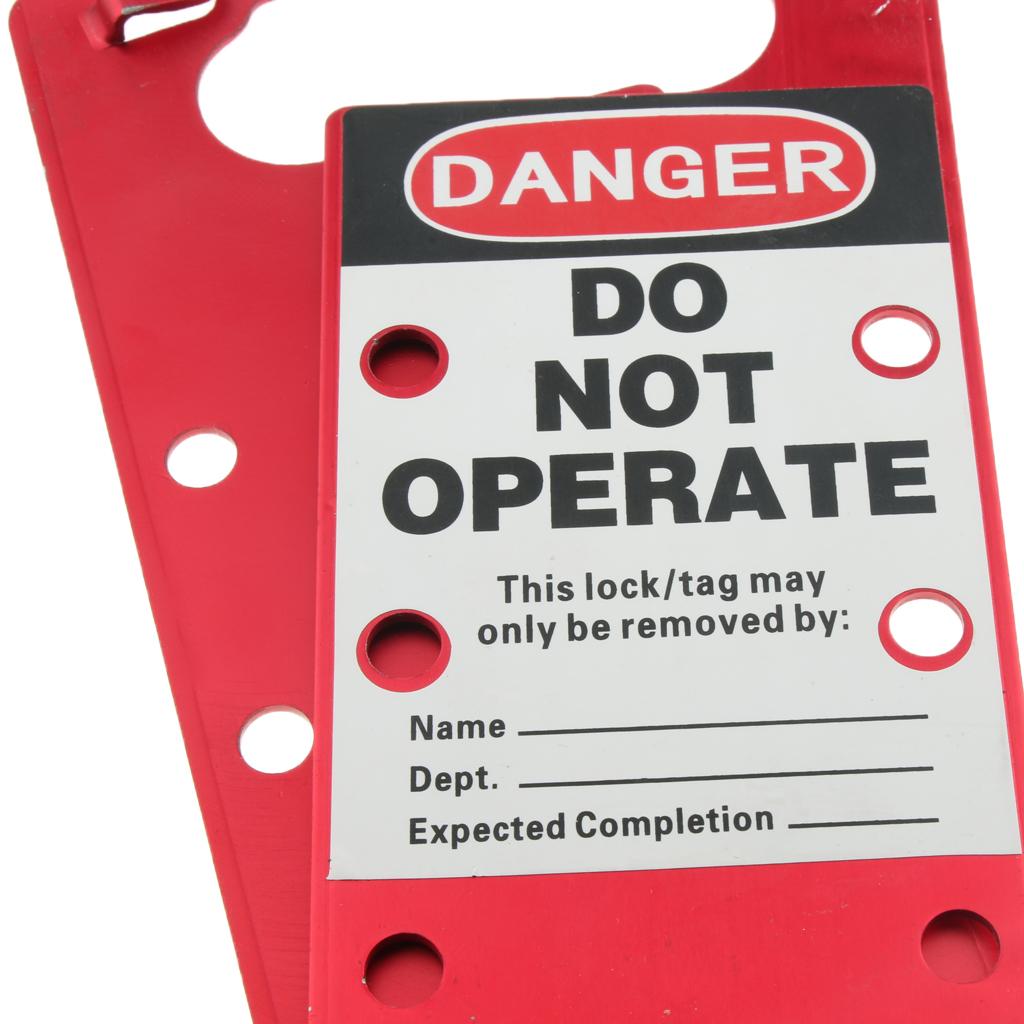 Six holes for padlocks provide ability to require multiple authorizations for access to one locked-out device or energy source