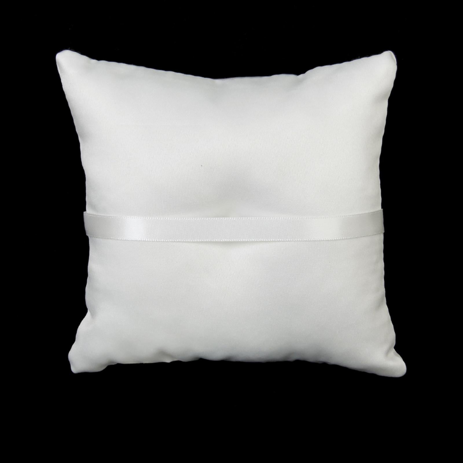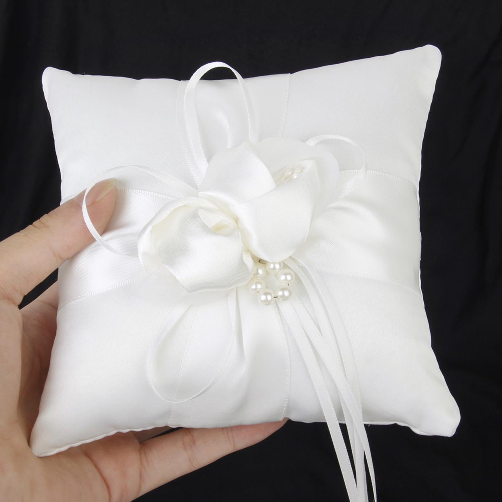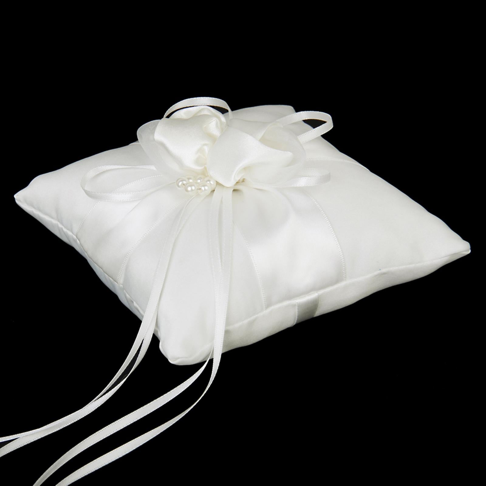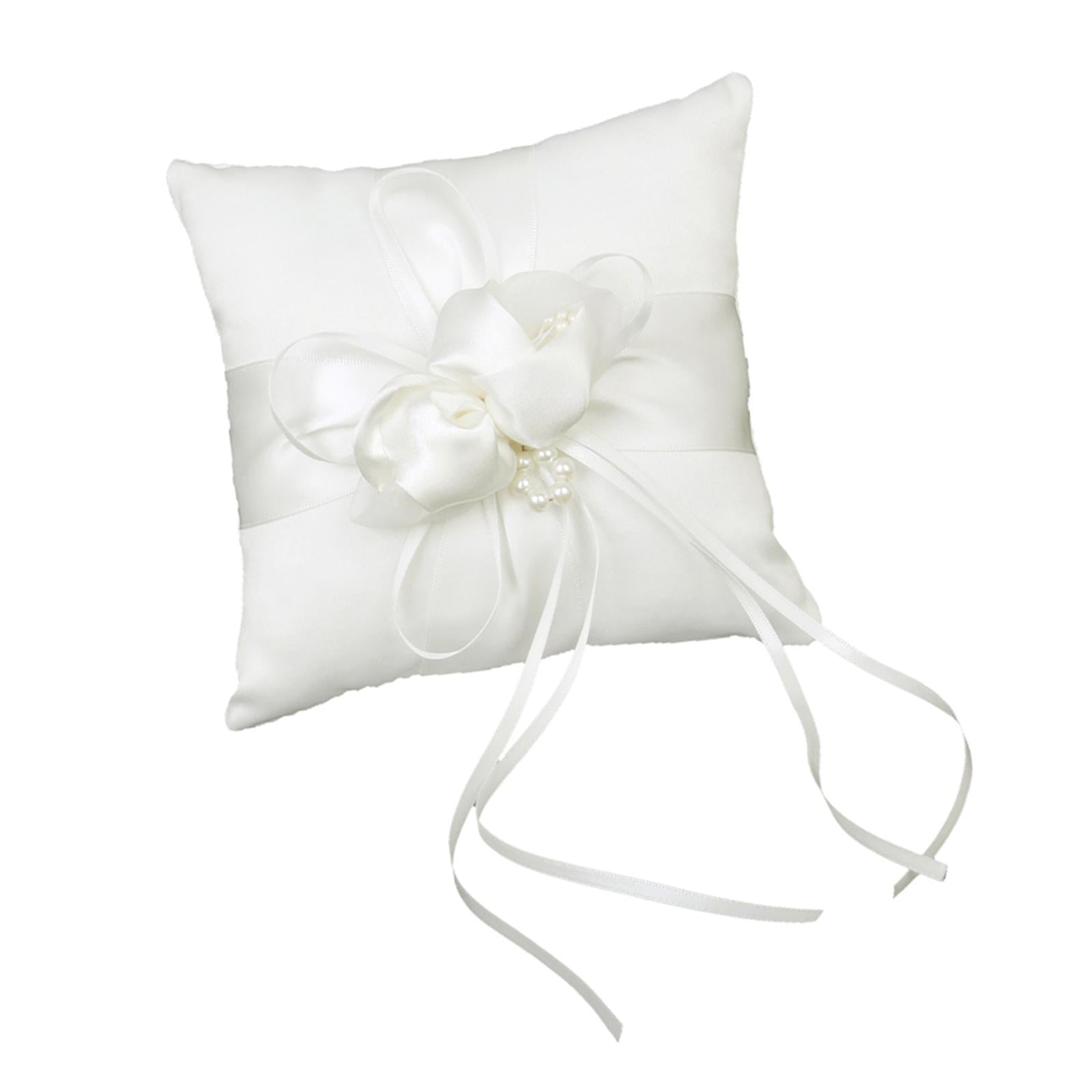 Ivory ring pillow decorated with satin ribbon and bud flower buckle to tie the ring