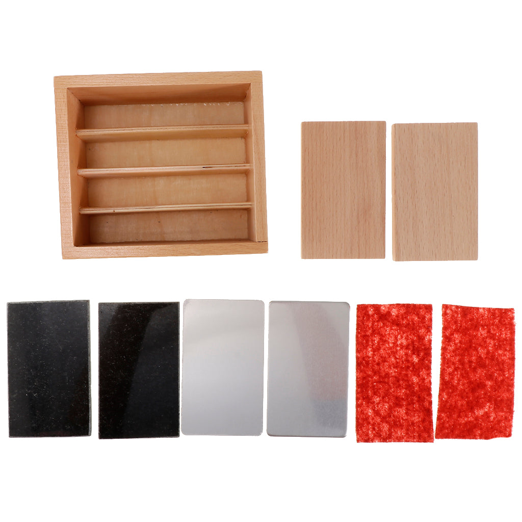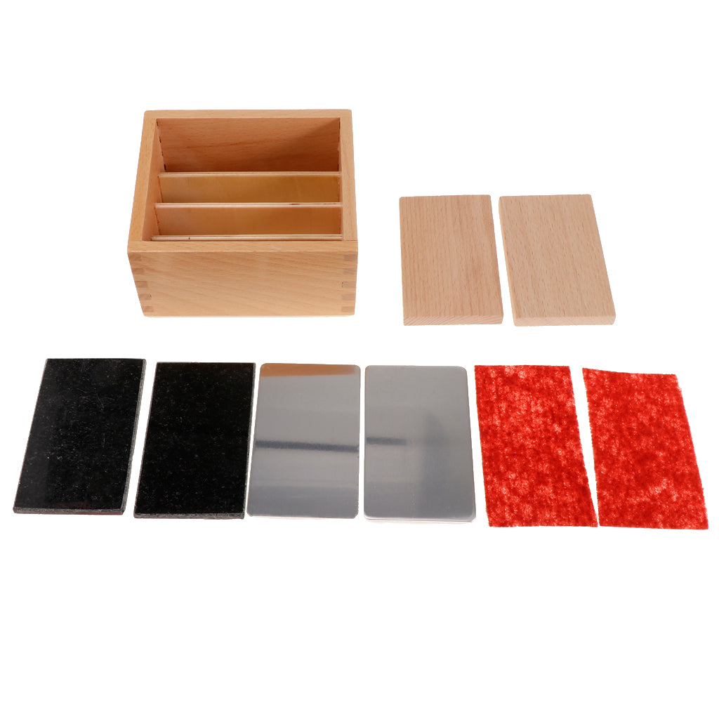 • A wooden box containing 4 pairs of different materials. The purpose is to teach kids refine tactile sense-discrimination of temperature